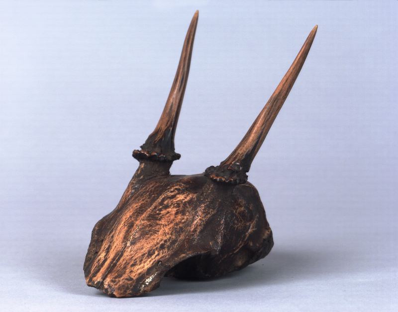 Blåsinstrument av en ung hjortskalle med 10.5 cm höga och spetsiga horn.