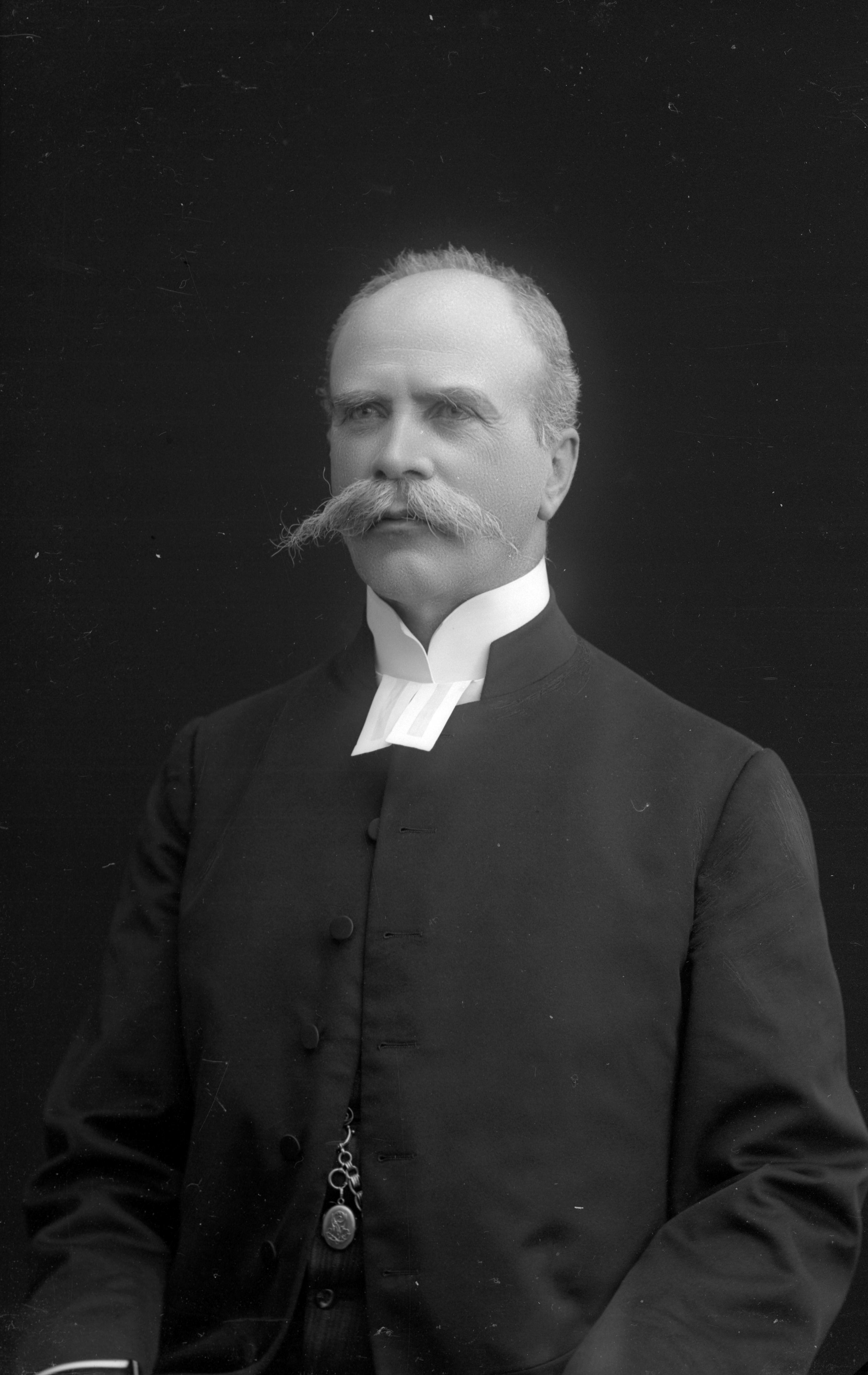Porträtt i halvfigur av Anders Ludvig Frick-Meijer, iklädd yrkesklädsel med prästkrage.