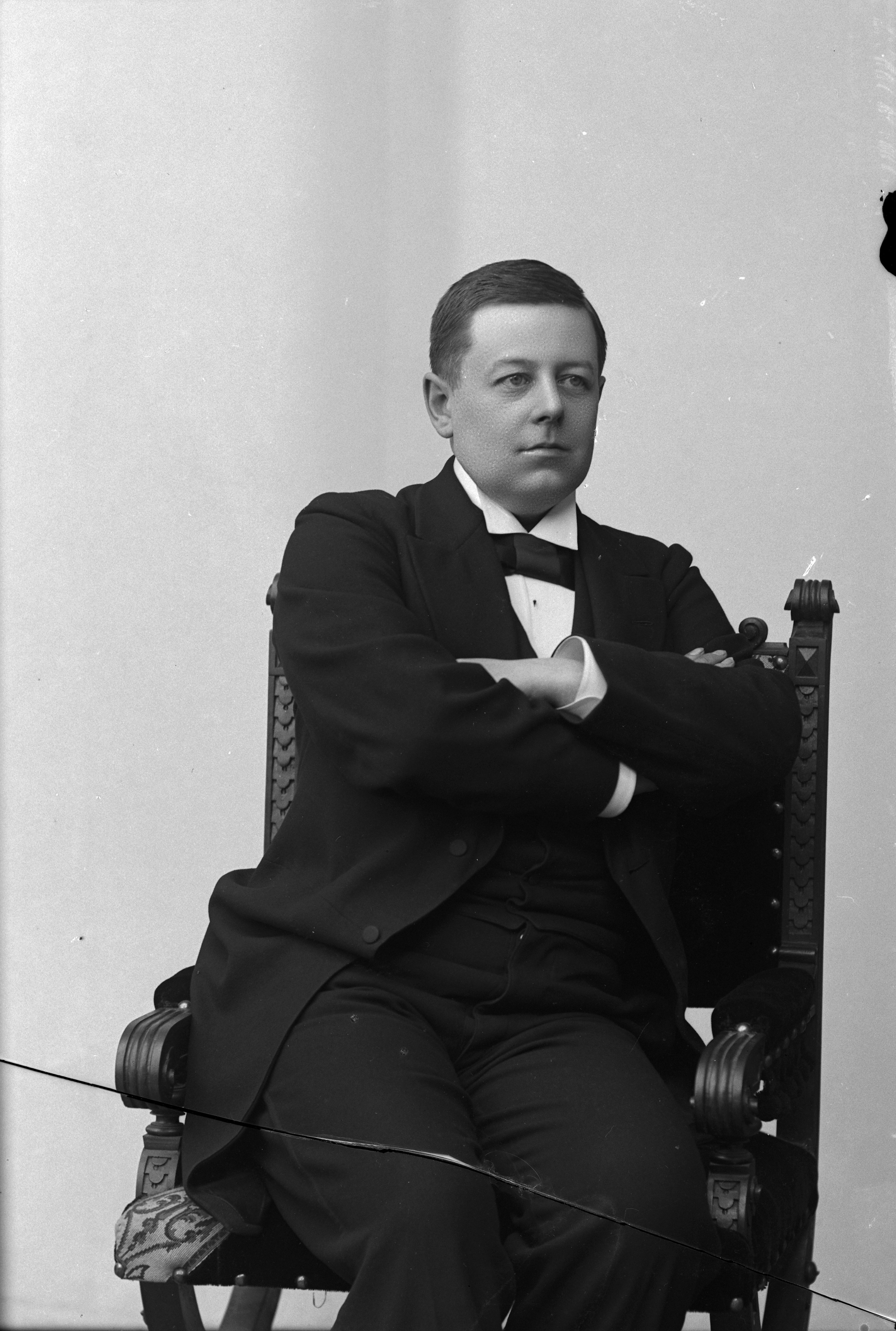 Porträtt i helfigur av herr Ljungberg, sittande i stol.