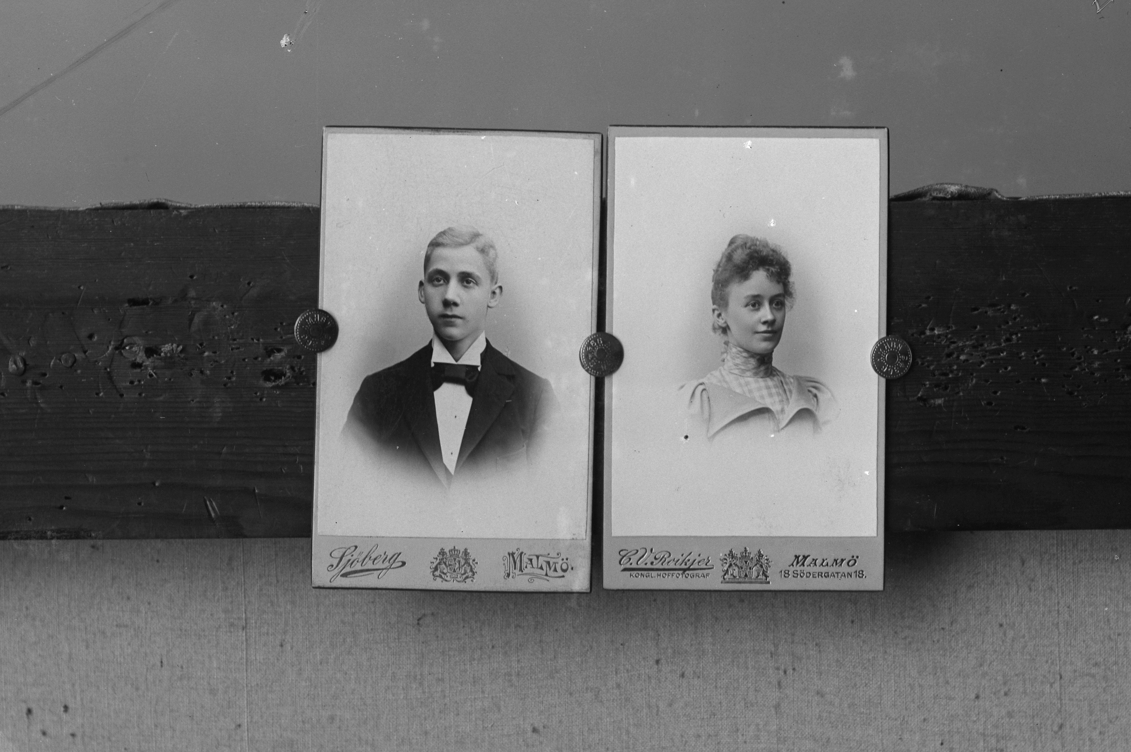 Två porträtt i halvfigur av oidentifierad man och kvinna. Ateljélogotyper med Axel Sjöberg och C. V. Roikjer synliga.