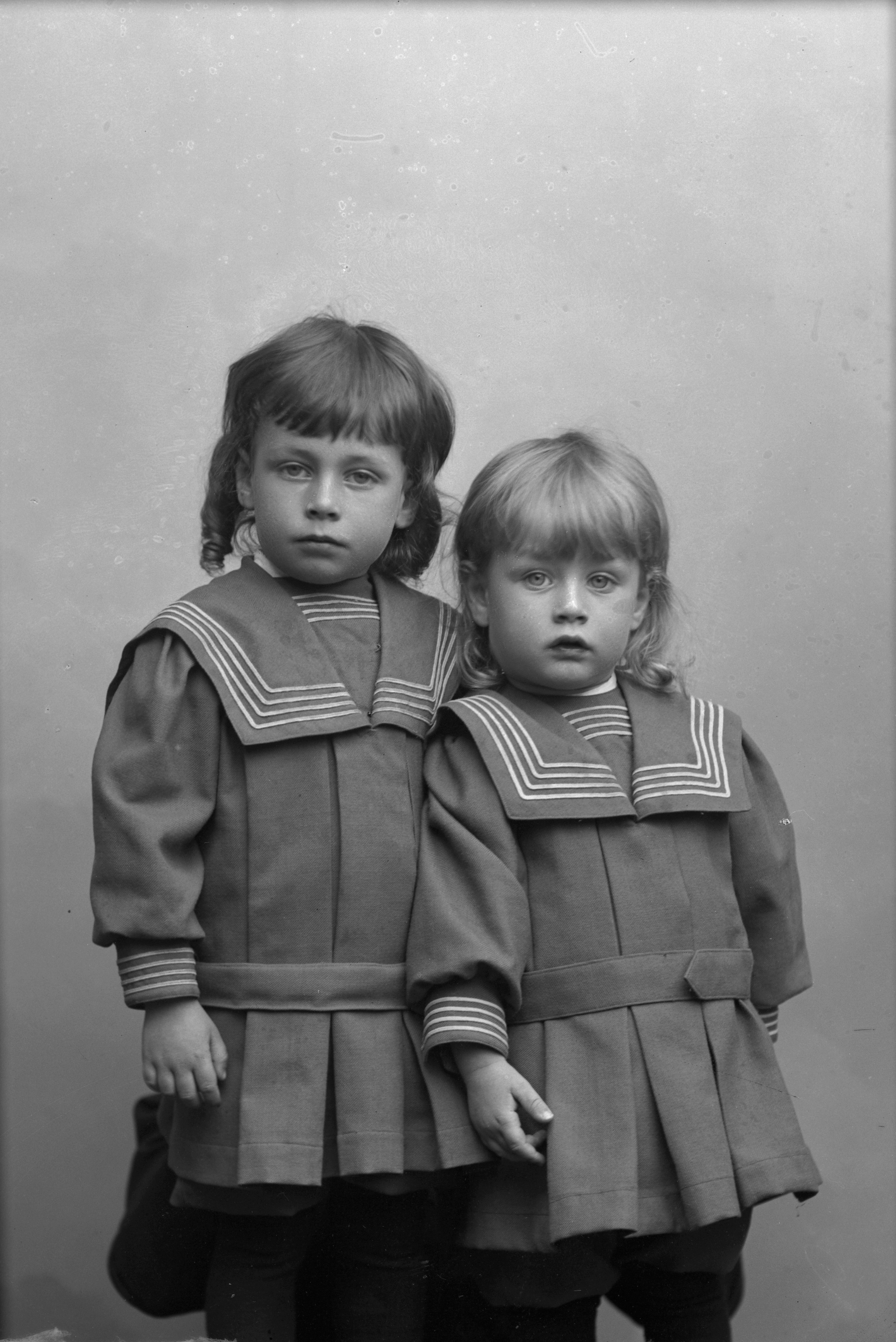 Porträtt i helfigur av Lindahls söner, iklädda sjömanskostym.
