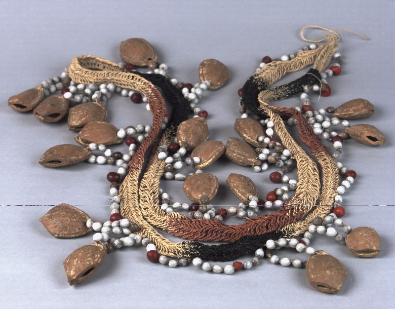 Dansbälte med grå, röda frön och nötter, vilka hänger på ett knutet