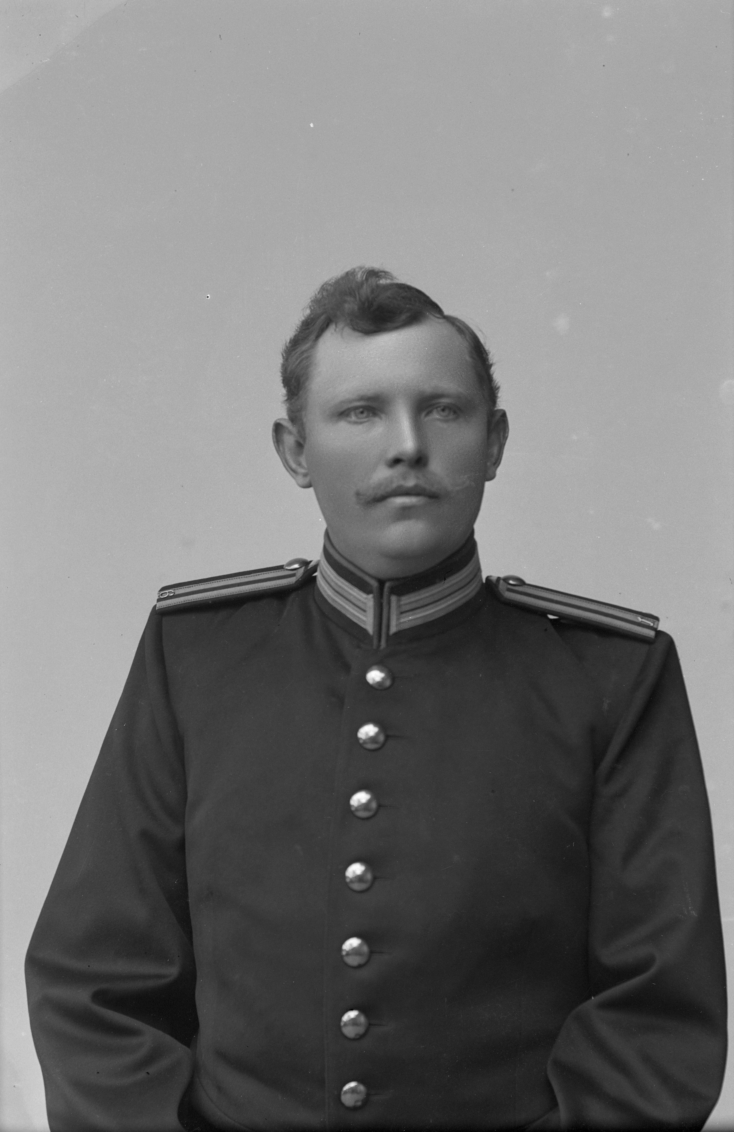 Porträtt i halvfigur av sergeant Carlström, iklädd militäruniform.