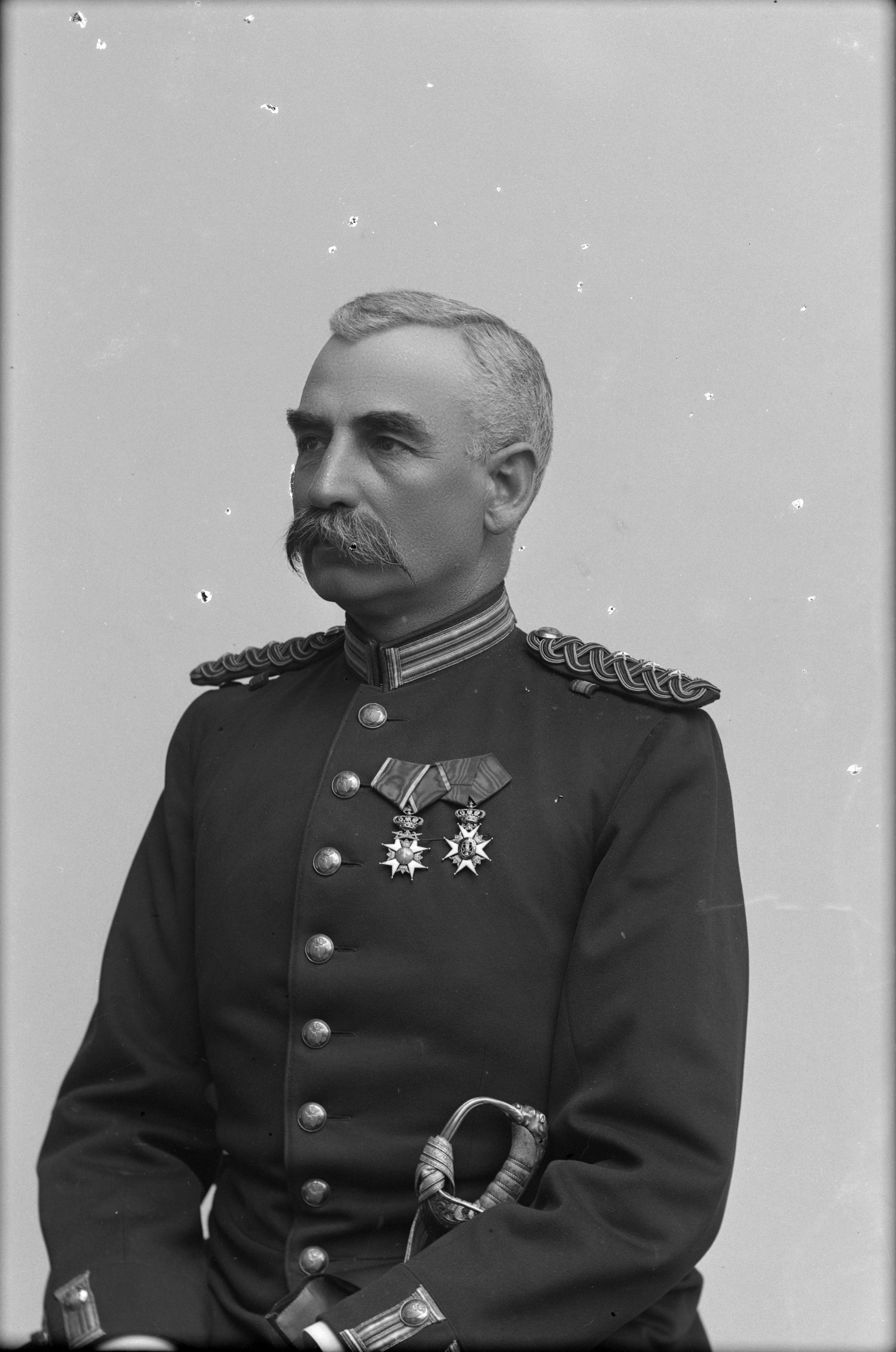 Porträtt i halvfigur av kapten Nilsson, iklädd militäruniform med medaljer på bröstet.