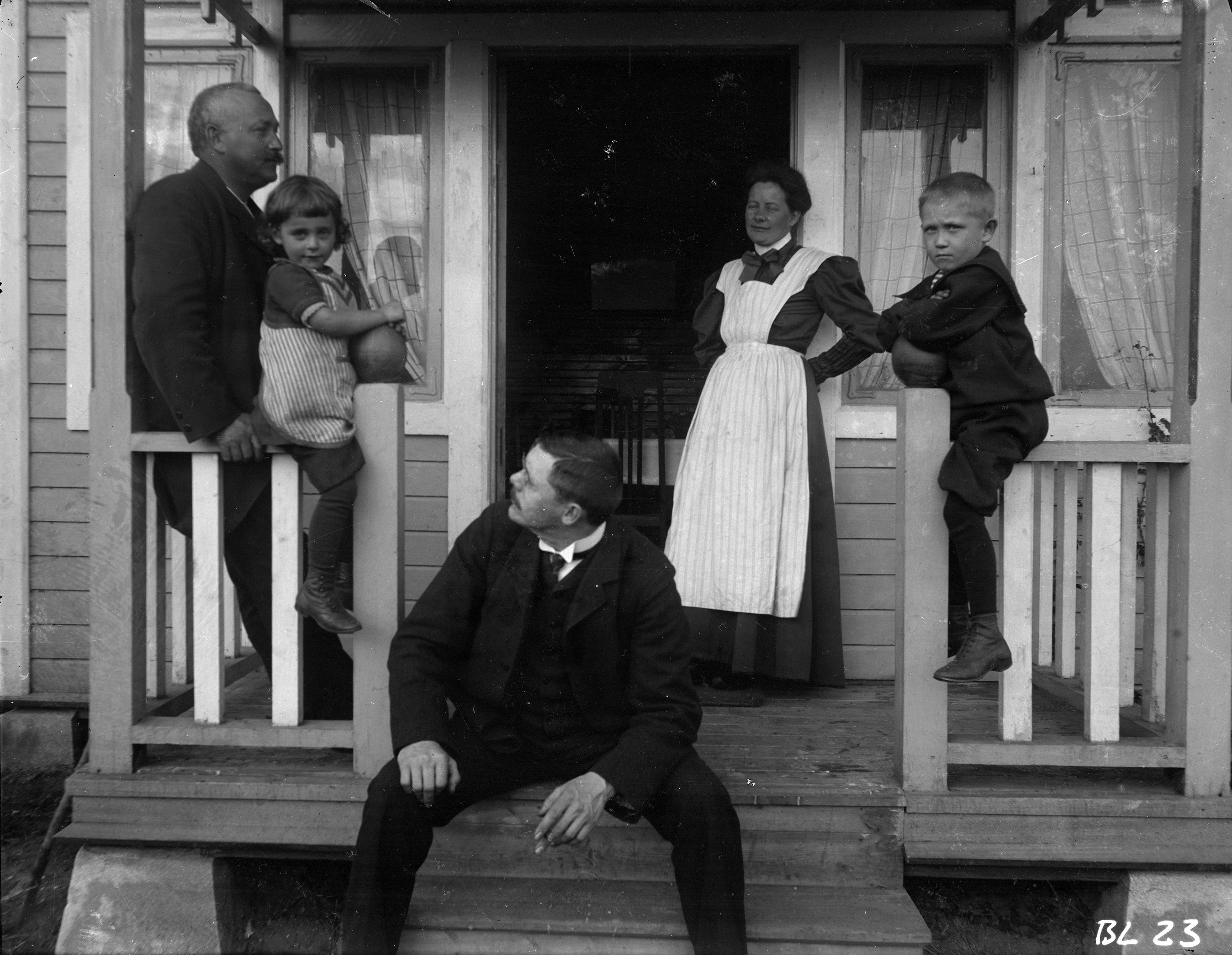 - Tre vuxna och två barn vid hustrappan.
