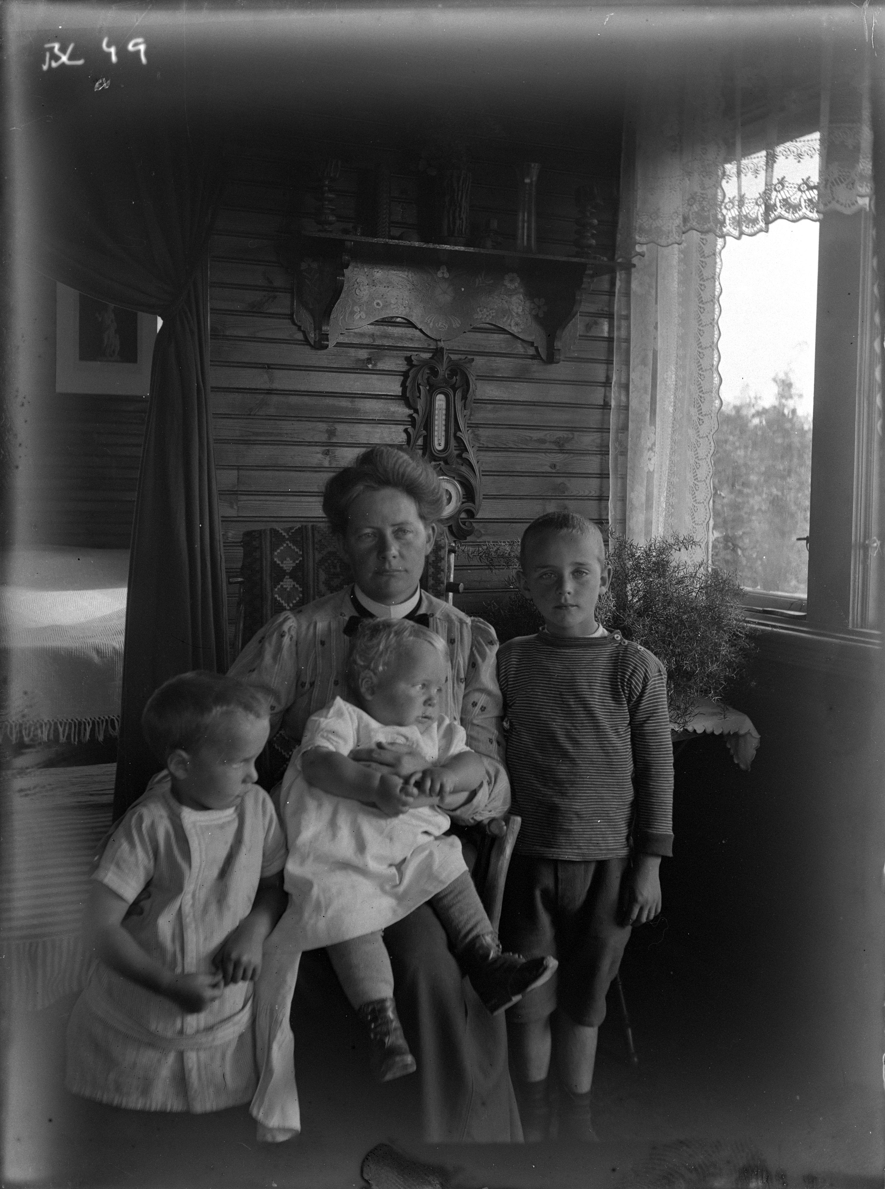 Stina Landby med barnen Kjell, Stig och Gösta Plats : sommarstugan på Vikingagatan
