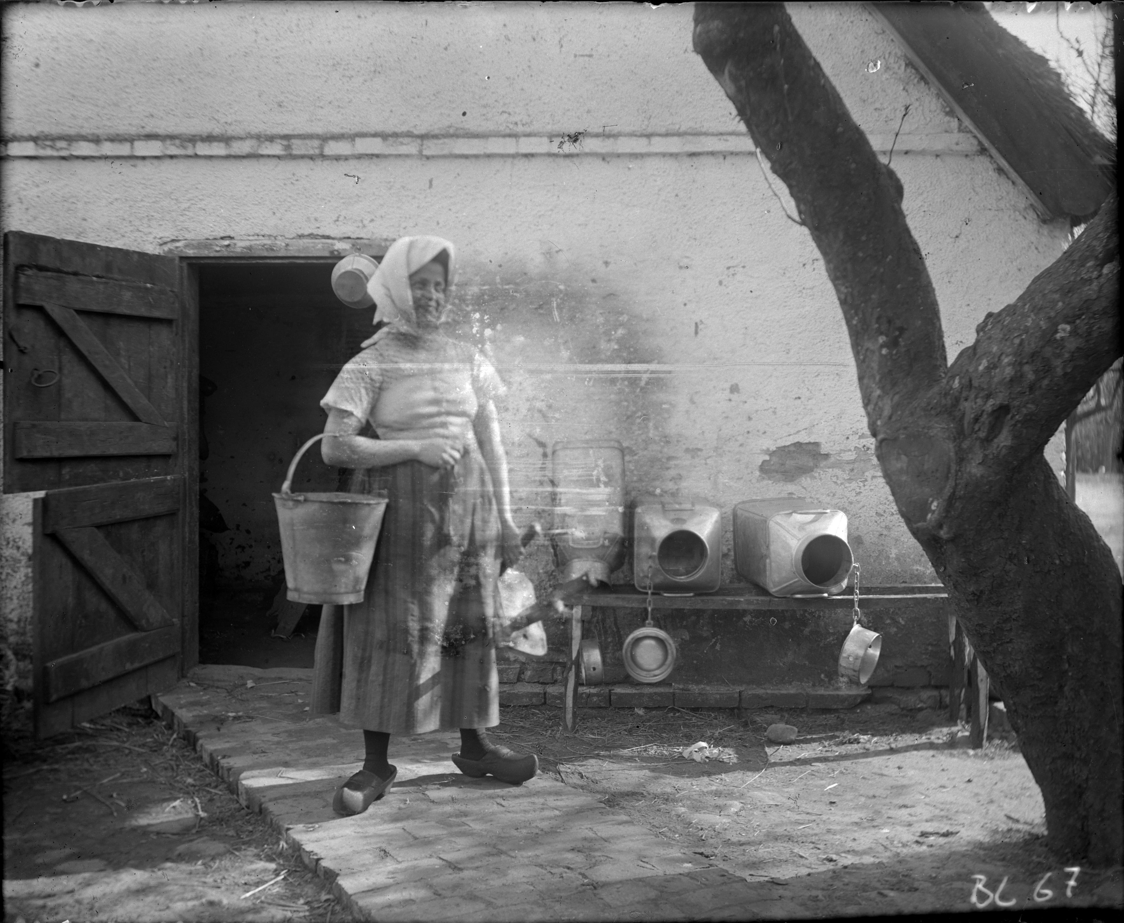 Bondekvinna i träskor framför stallet, spann och mjölkkannor.