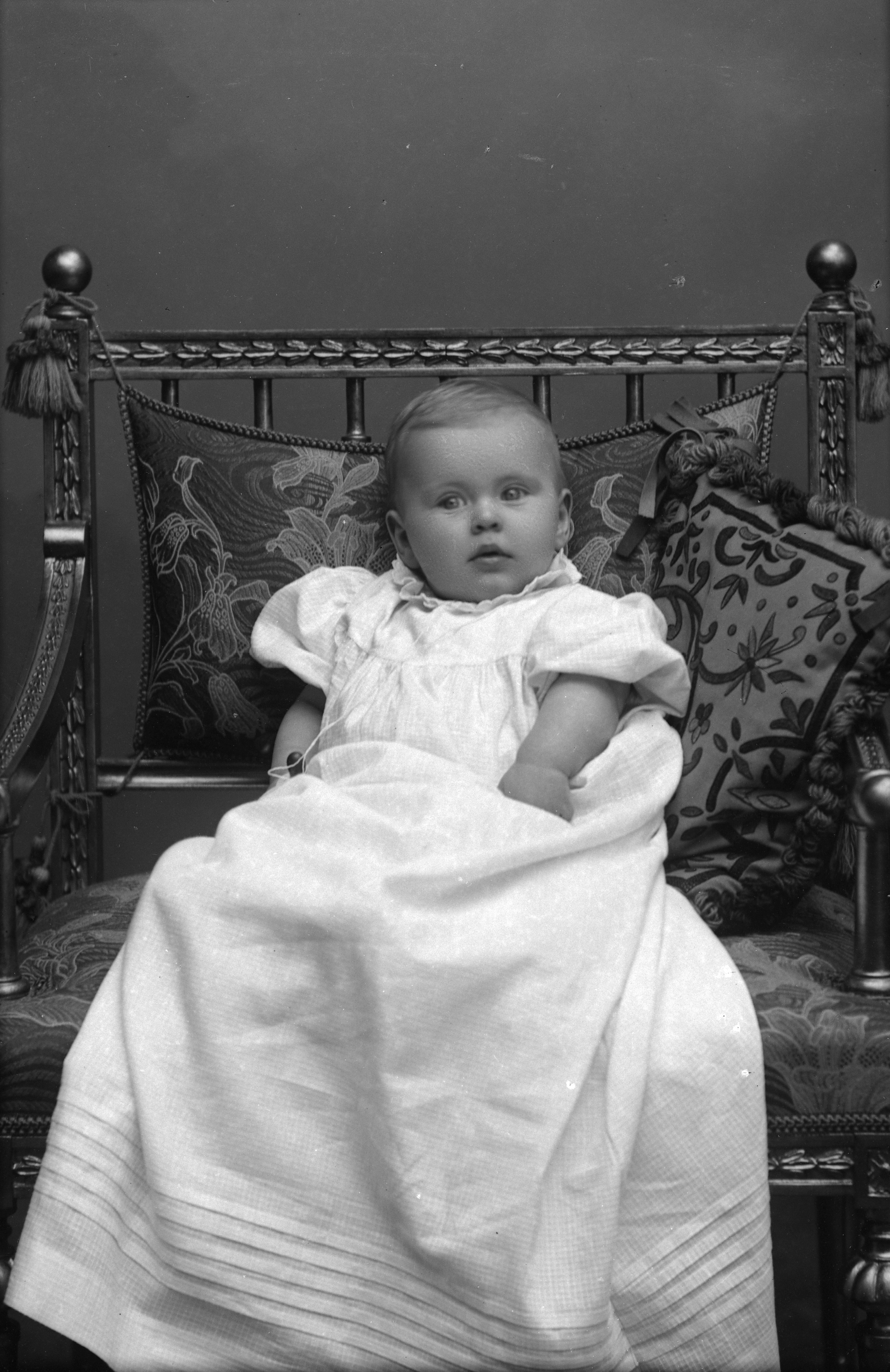 Porträtt i helfigur av Christer Nilssons barn i dopklänning.
