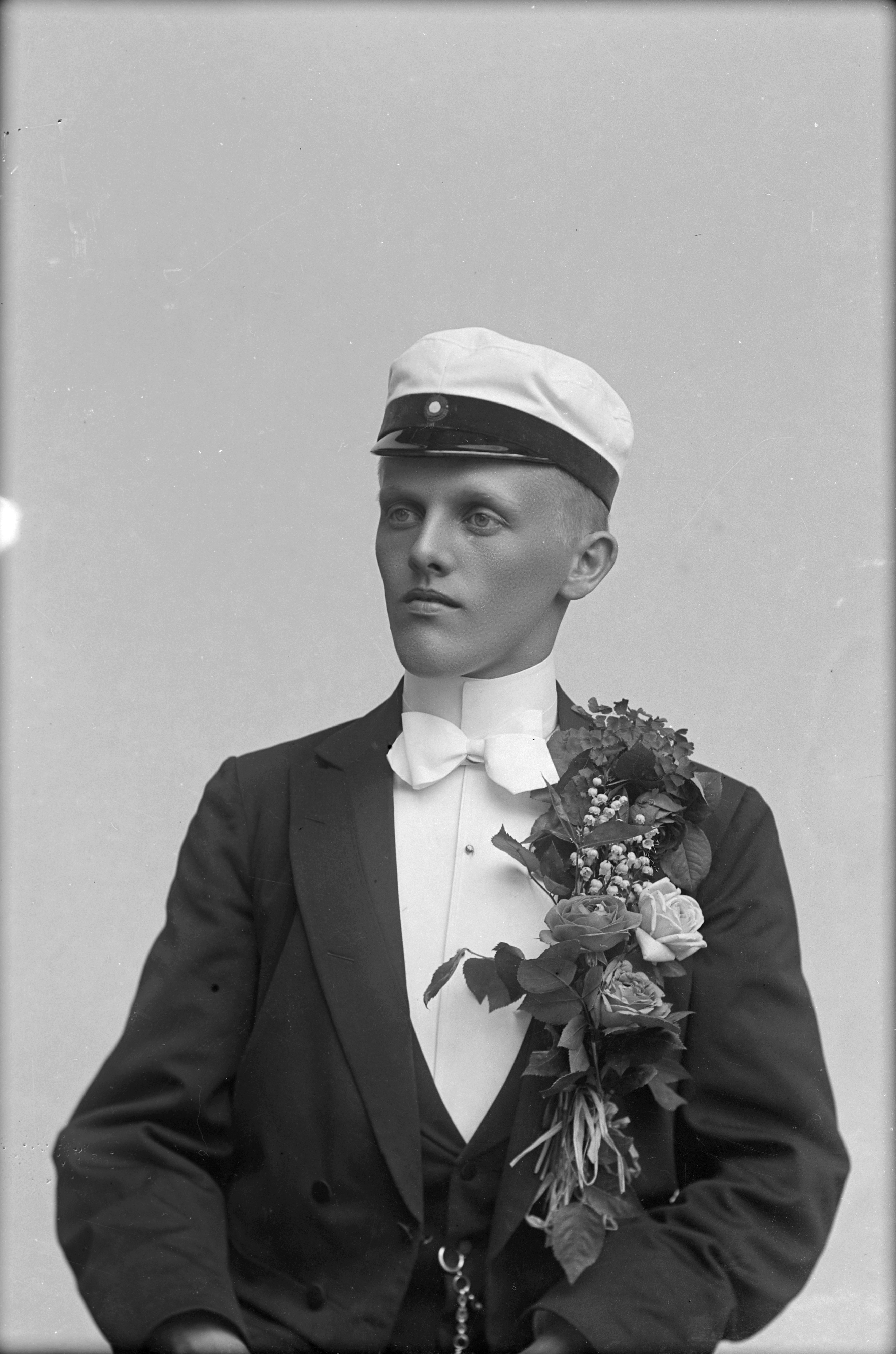 Porträtt i halvfigur av arkitekt August Stoltz, iklädd studentmössa, med blomster på kavajen.