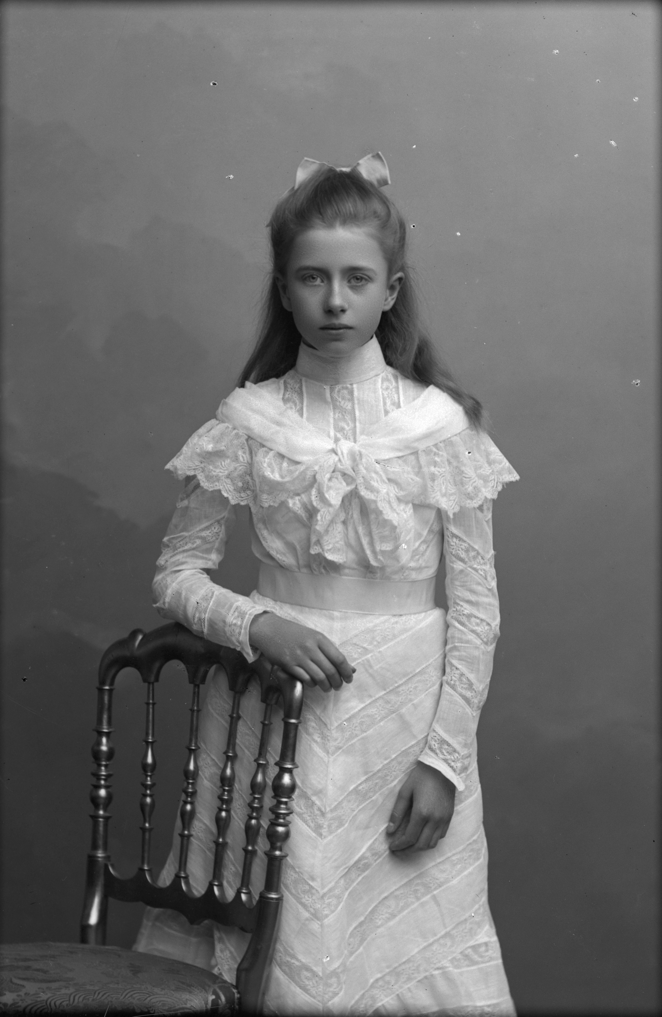 Porträtt i helfigur av Wrangels dotter, stående vid stol.