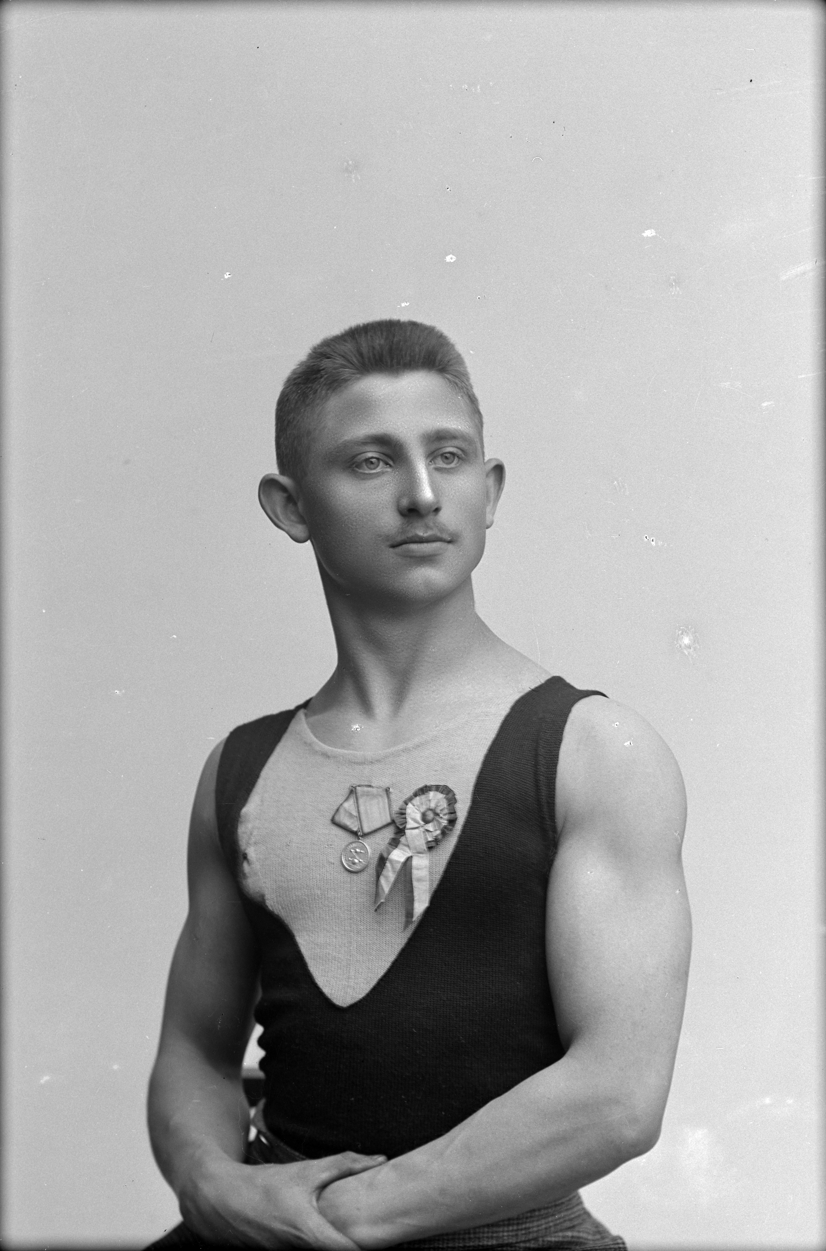 Porträtt i halvfigur av Axel Nyman klädd i idrottdsräkt, bärande medaljer på bröstet.