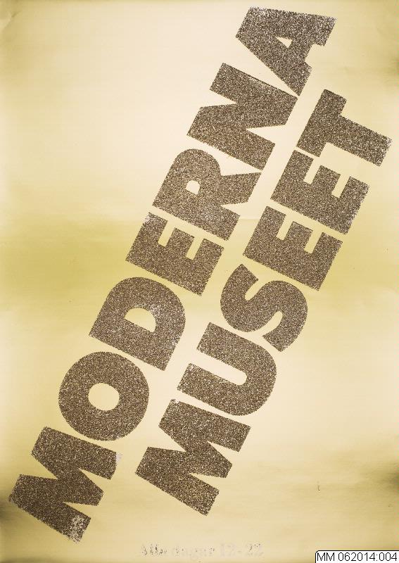 - Skiss eller förlaga till affisch för Moderna Museet i Stockholm. Ockra text på guldfärgat papper:"MODERNA MUSEET" (diagonalt från nvh till öhh) samt centrerat i nederkant "Alla dagar 12-22". I denna samling finns olika varianter på denna affischidé vad gäller färgvalörer och material. Denna variant är gjord på guldfärgad kartong, textfältet har bestrukits med lim och på dessa ytor har ett fröliknande dekorationsmaterial fästs. Förmodligen är det organiskt material (hirsfrön eller vallmofrön?), blandat med glitter av metall. Just denna variant får väl betraktas som ett slags originalverk, omöjligt att överföra till masstryck, men kanske i en hantverksgjord mindre upplaga?