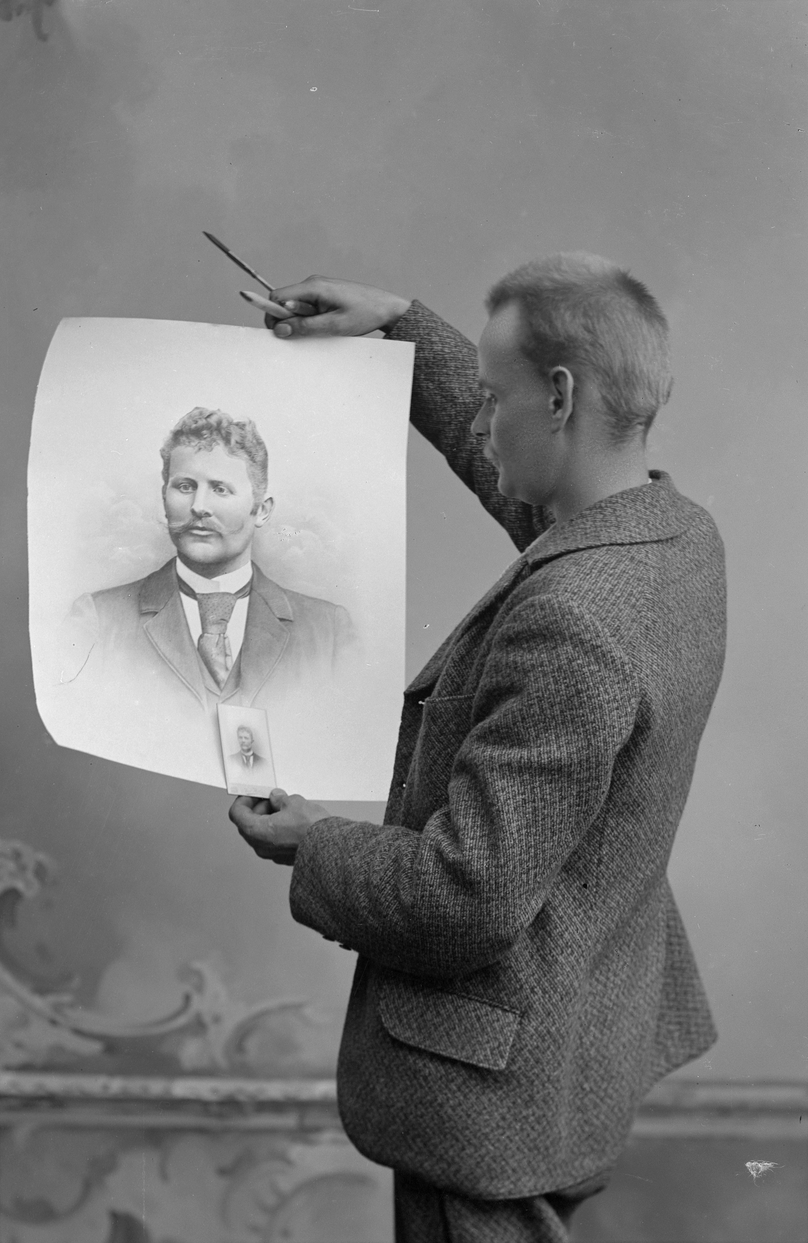 Porträtt i helfigur av Rickard Feldt, hållande stort fotografi.