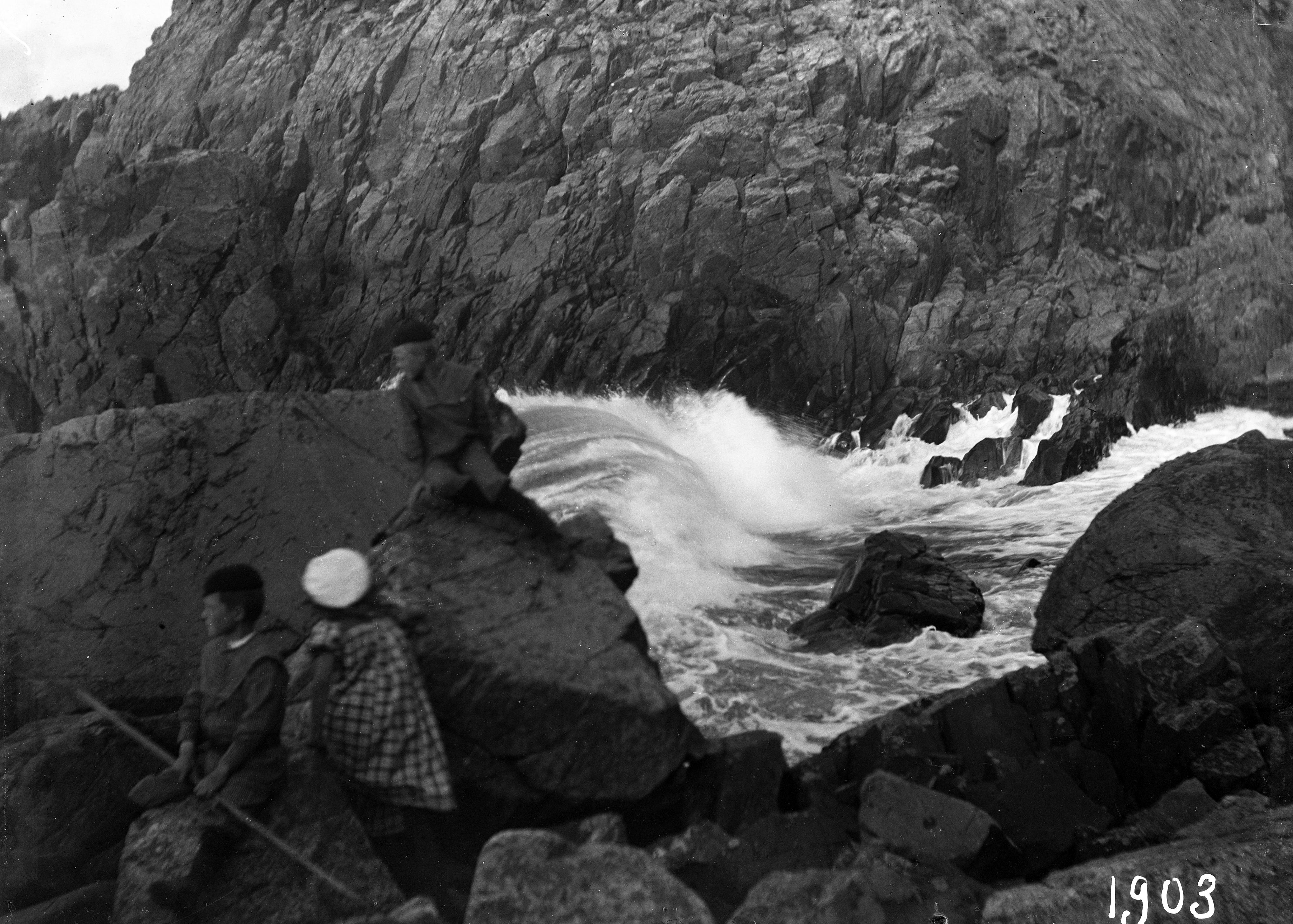 Pojke och flicka vid klippig havsstrand. 1903