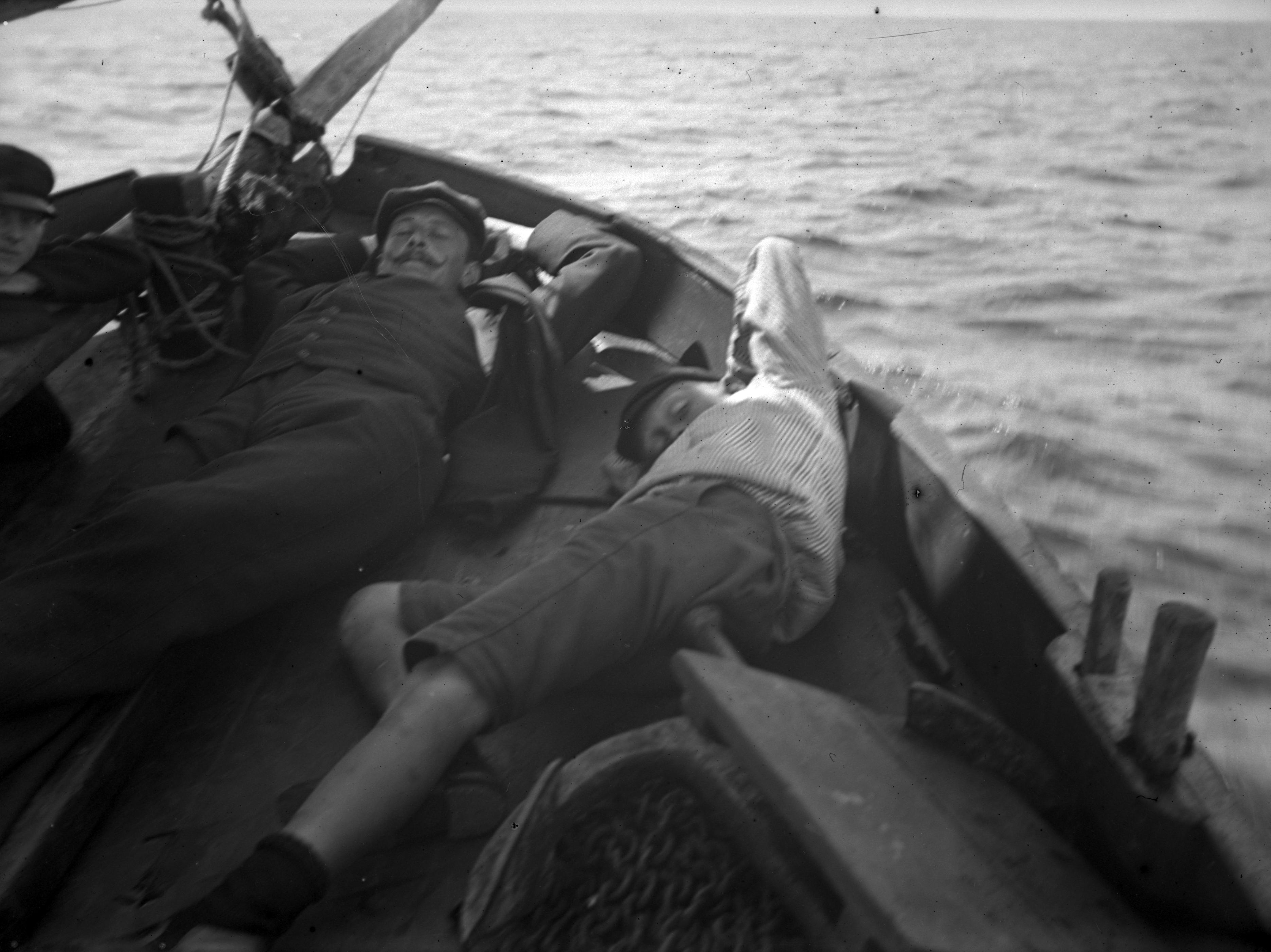 Edvin Thomèe vilar i båten, två pojkar. 1897.