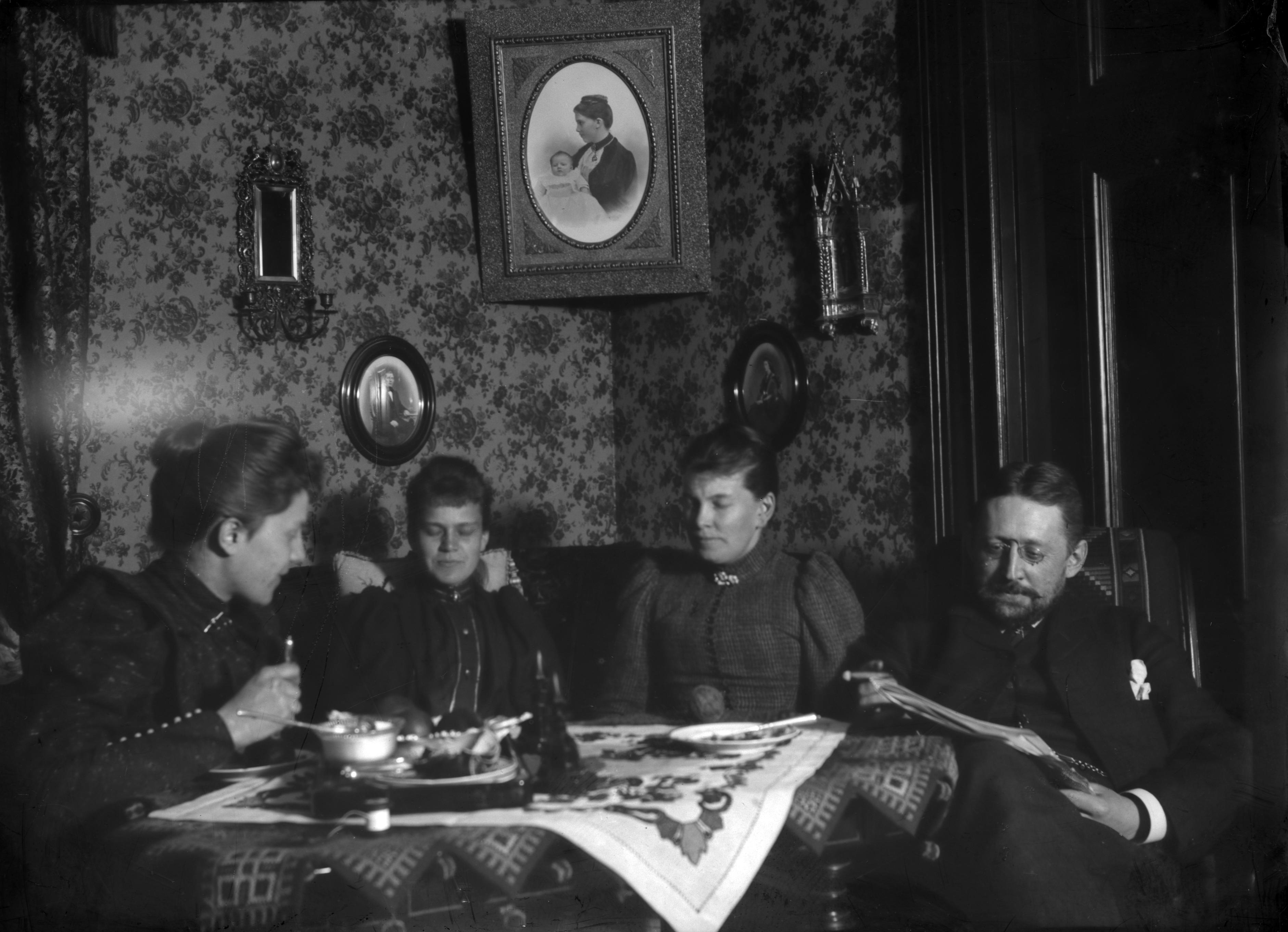 Interiör man, tre kvinnor vid bordet. 1896.