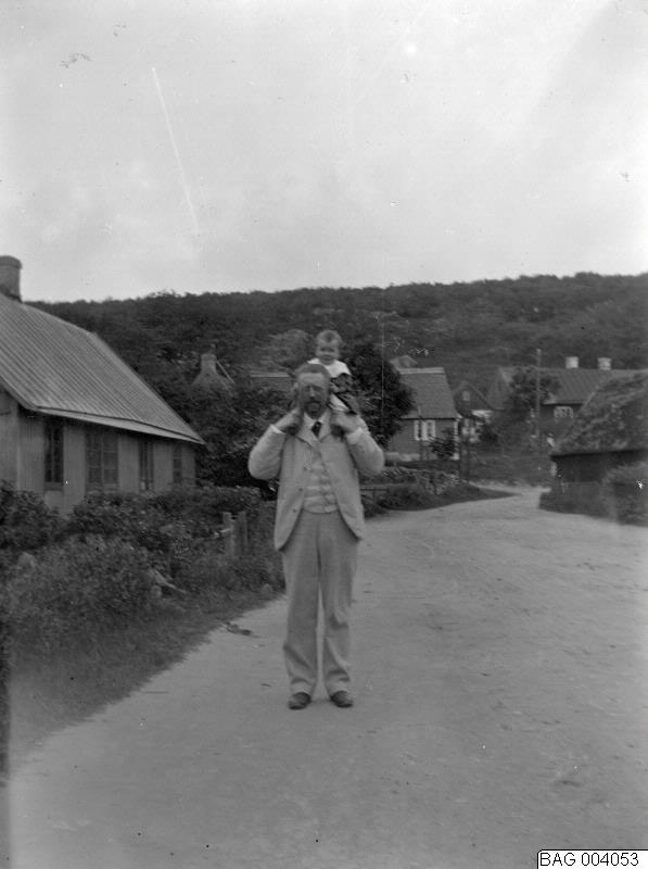 Bygata, Harald B. med litet barn på axlarna. Neg. 1902.