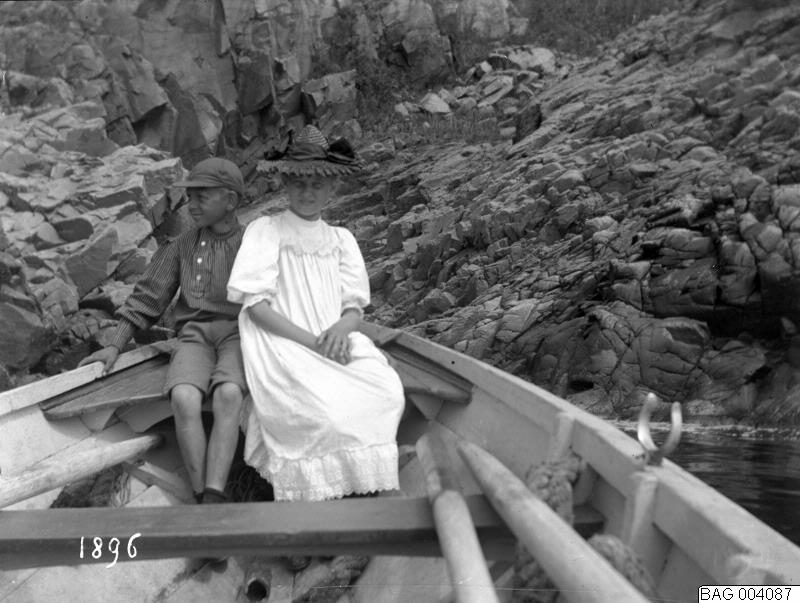 Flicka och pojke i roddbåt vid klippor. 1896.