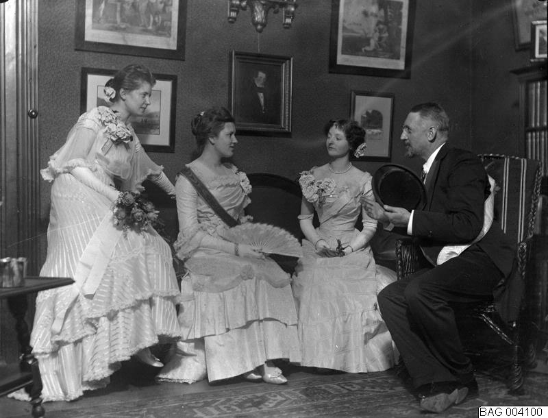 Rumsint. Harald, Ellen, Inez, en kvinna till, finklädda till Amaranthbalen. 1908.
