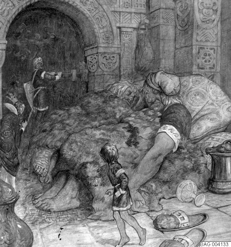 Sovande jätte och liten pojke. Tush? (Einar Bagers sagoteckningar) år?