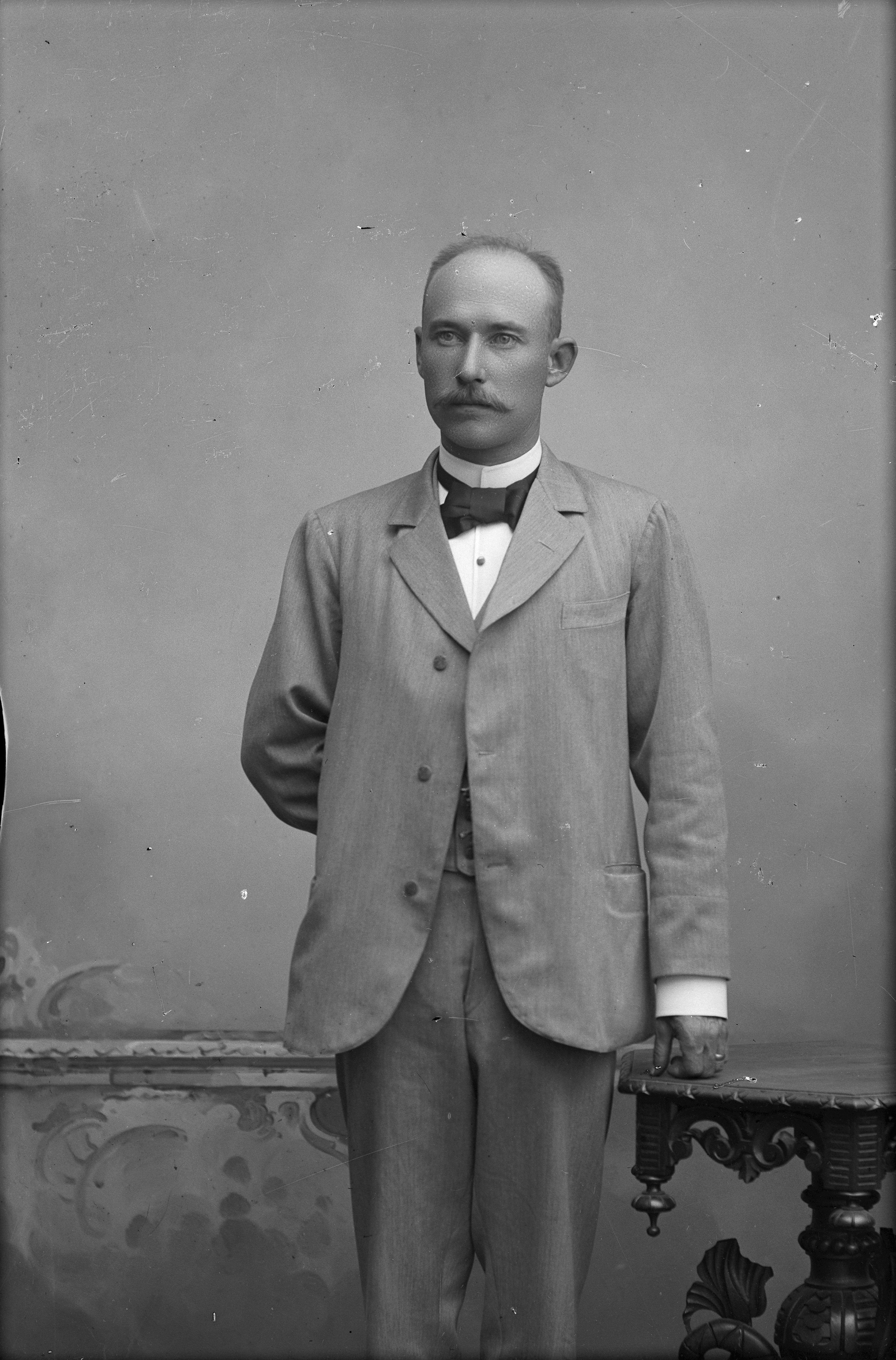 Porträtt i helfigur av kandiat August Theodor Vifell, stående vid bord.