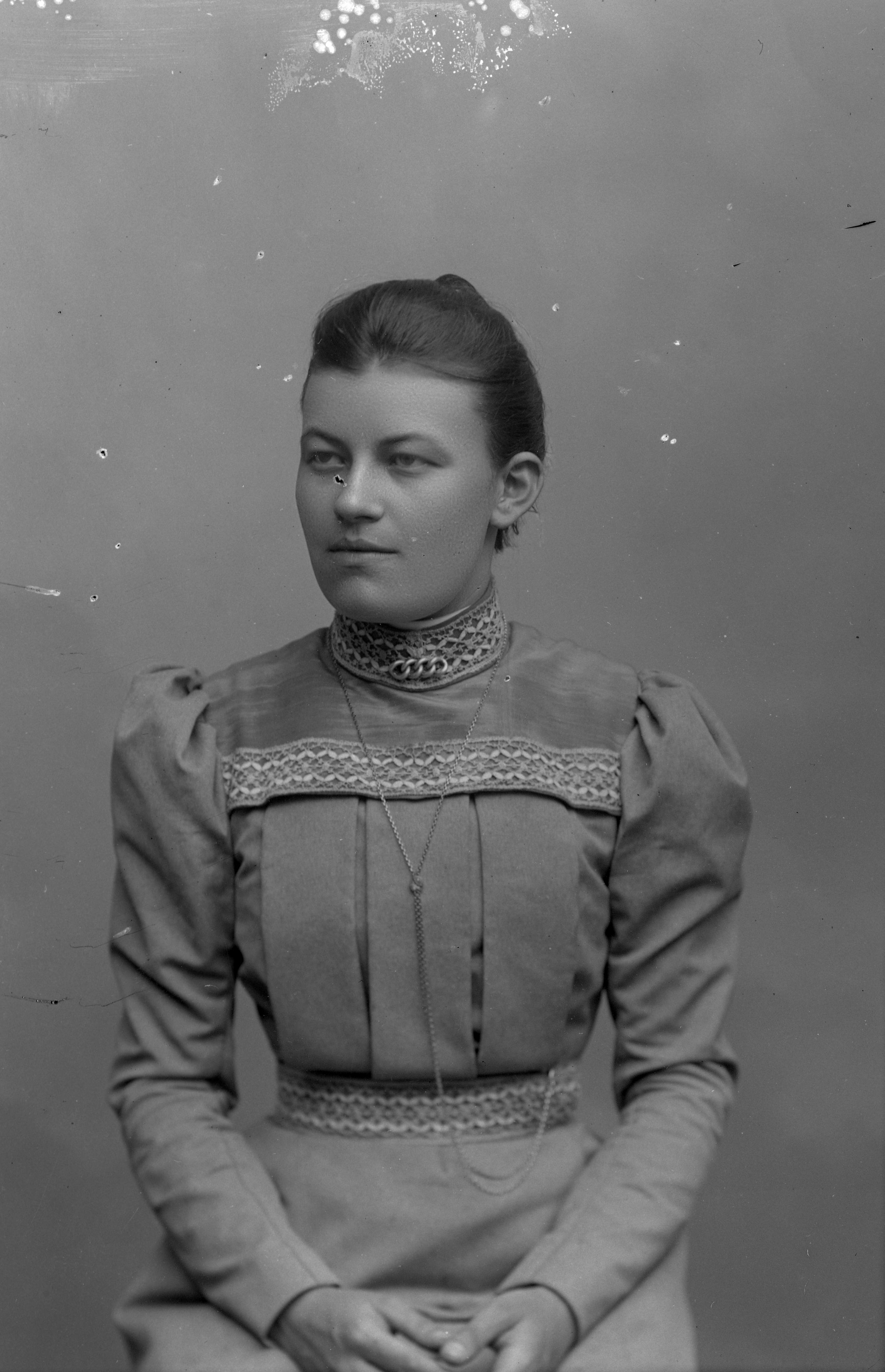 Porträtt i halvfigur av småskollärarinnan Alma Rasmusson. Dotter byggnadssnickare Mårten Rasmusson (1843-1923) och Malena Nilsdotter (1850-1935).