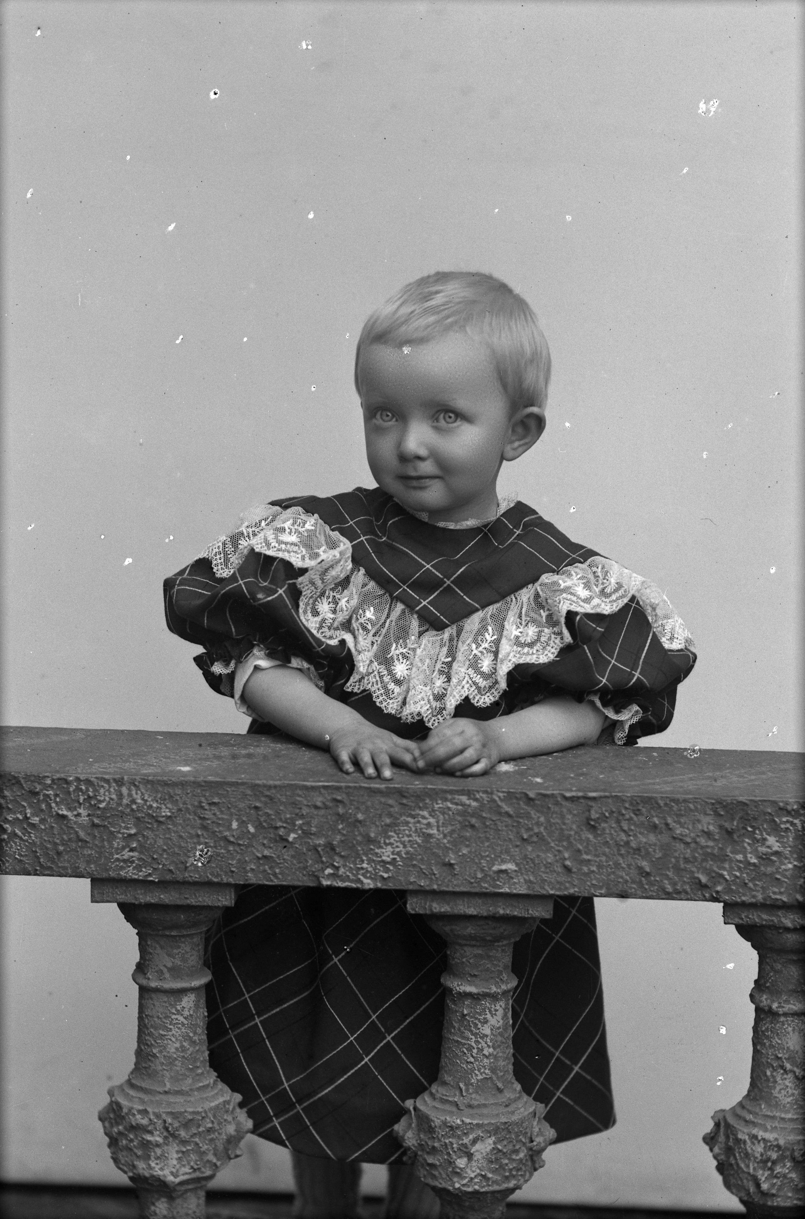 Porträtt i helfigur av J. Larssons dotter, stående vid stenstaket.