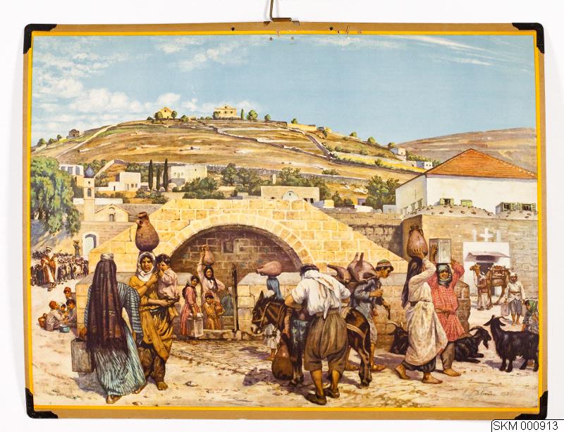 Brunnen är infattad i en byggnad av stora kalkstensblock. Kvinnorna, som gå dit, bära de tomma krusen i vågrät ställning, såsom kvinnan bakom åsnan. När de gå därifrån, ställa de krusen upprätt på huvudet. På senare år har man också börjat använda bensindunkar. Även männen hämta vatten men i läder- oeller skinnsäckar. På bilden synas tvenne vattenförsäljare. Mannen med åsnan är en sådan. Vattenbäraren bakom honom ämnar avyttra sin värdefulla produkt på gatorna. I Galileen har kvinnoklädseln några speciella kännemärken, som ej återfinnas i Judeen och endast delvis i Samarien. De bära fotsida benkläder, ansiktet är obetäckt, fötterna bara. Männen åter ha sandaler eller lågskor.