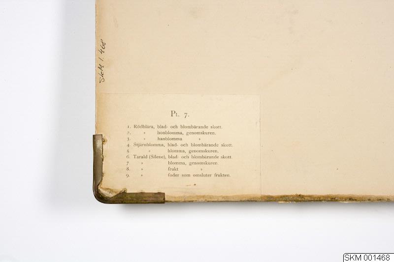 Planschserie, växter: 7. Rödblära, buskstjärnblomma, tarald. Med hängare utan kantband. Hörnskydd av metall. Två saknas. På papp.