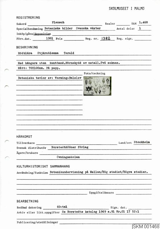 Skolplansch. Rödblära, stjärnblomma, tarald. Med hängare utan kantband. Hörnskydd av metall. Två saknas. På papp.