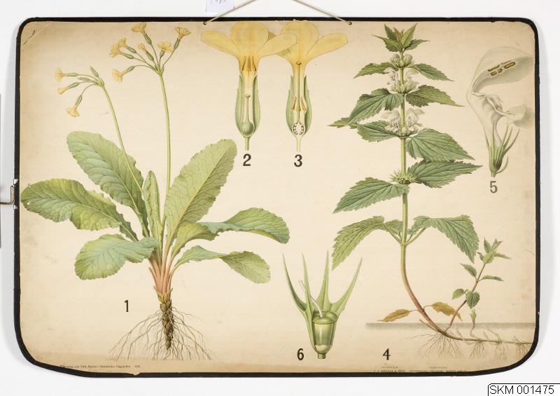 Skolplansch. Gullviva (Primula veris), vitplister (Lamium album).