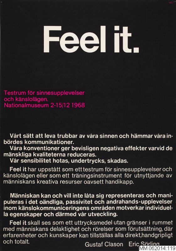 - Affisch till Nationalmuseum i Stockholm för en utställning med titeln "Feel it". Det är en ren textaffisch och det är mycket text som fyller större delen av det svarta tryckarket. Överst finns titeln "Feel it." i 10,5 cm stor textstorlek, fet stil, centrerat negativvänt vitt tryck. Därunder i mindre textstorlek, tryckt i signalröd färg mot den svarta bottnen: "Testrum för sinnesupplevelser / och känslolägen / Nationalmuseum 2-15/12 1968". Under detta finns ytterligare fyra textblock i blandad enkel och fet markerad stil som förklarar utställningens idémässiga bakgrund, inriktning och målsättning, allra nederst signerat av de två upphovsmännen till utställningen : "Gustaf Clason Eric Sörling". I övre högra hörnet finns i mycket liten textstorlek upphovsmannen "Melin" angiven i röd färg. Se även undernr 44, 120 och 121 för andra varianter på affischens utformning då samma utställning visades i New York, USA.