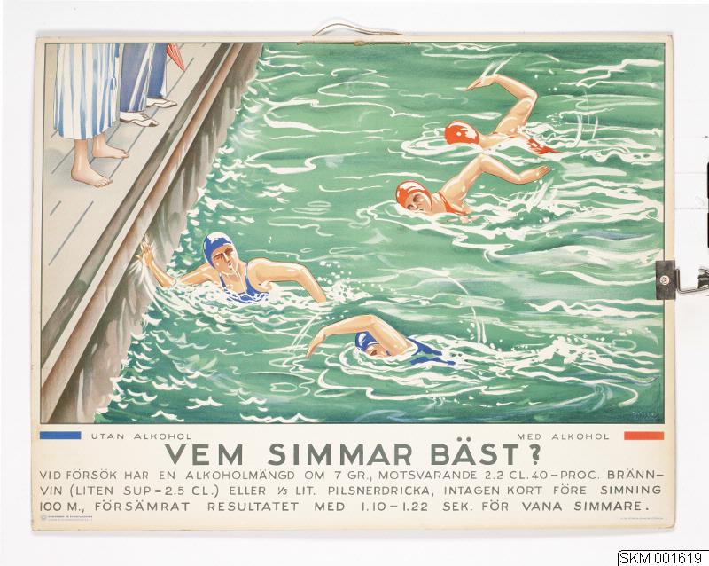 Vid försök har en alkoholmängd om 7 gr., motsvarande 2.2 cl. 40 - proc. brännvin (liten sup = 2.5 cl.) eller 1/5 lit. pilsnerdricka, intagen kort före simning 100 m., försämrat resultatet med 1.10-1.22 sek. för vana simmare.