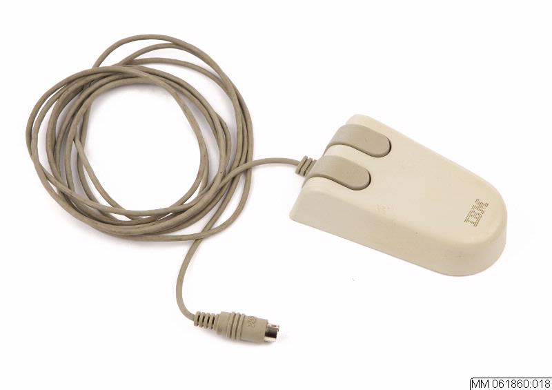 Datormus två knappar och gummikula. PS/2 kontakt. Standarden introducerades 1986. Manufactered for IBM Corporation Armonk New York. Made in Japan