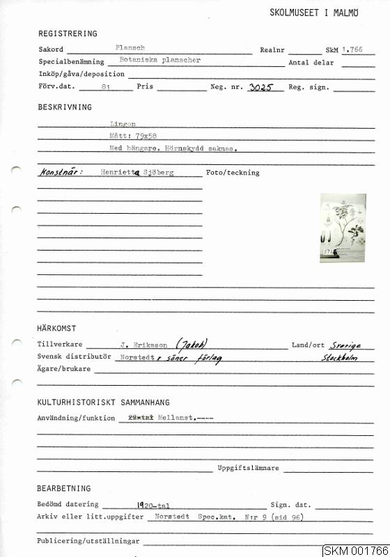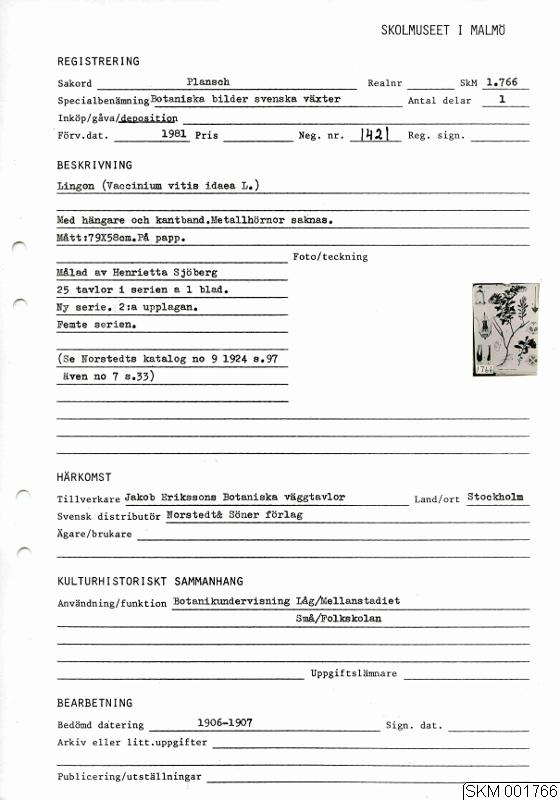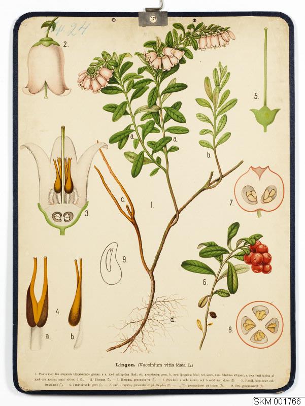 J. Eriksson. Botaniska väggtaflor. Ny serie: Tafla 24. Lingon. Med hängare och kantband. Metallhörnor saknas. På papp.