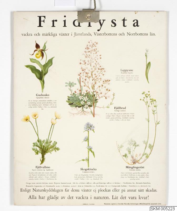 Plansch: Växter: Fridlysta, vackra och märkliga växter i Jämtlands, Västerbottens och Norrbottens län. Med hängare utan kantband och metallhörnor. På papp.