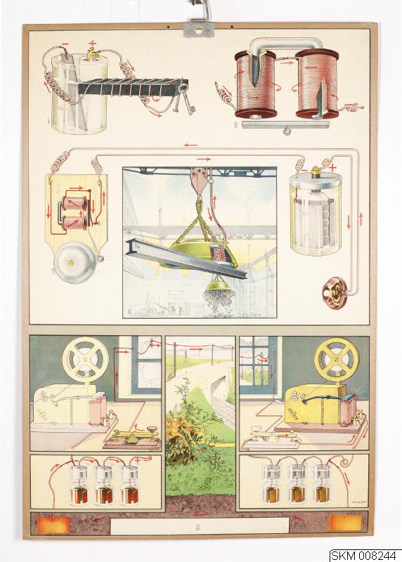 Bild 1. Järnstav av mjukt järn med en spiralformigt lindad ledningstråd, vars ändar anslutits till en strömkälla. Härigenom blir järnstaven magnetisk och förmår fasthålla smärre föremål av järn, såsom spik, nycklar m. m.