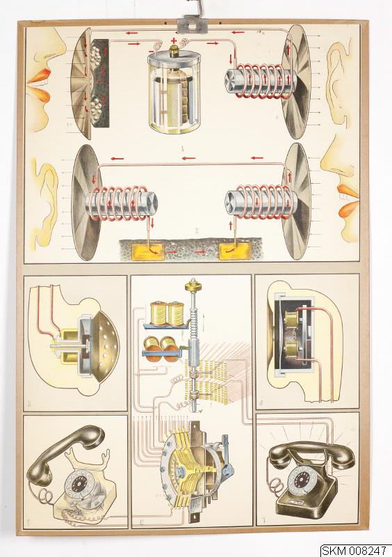 Bild 1 visar en mikrofon och en hörtelefon i princip. Mikrofonen är den inom telefonen allmänt använda kolkornsmikrofonen, bestående av två kol- eller grafitplattor, den enda fast och den andra ofta utformad till ett membran, mot vilken ljudvågorna infalla. Mellan plattorna finnes ett stort antal kolkorn. Hörtelefonen består av en elektromagnet och en rund skiva av järnbleck. Talar man nu mot mikrofonen (Tr) så försättes membranen (m) i snabba svängningar, varvid kolkornen sammanpressas mer eller mindre och strömmen från strömkällan genom mikrofonen varieras och framkallar motsvarande variationer i magnetstyrkan i hörtelefonen (R) och därmed i kraften på membranen (LD), varför denna kommer att repetera svängningarna i membranen hos mikrofonen. I hörtelefonen kan man således uppfatta vad som tala i mikrofonen.