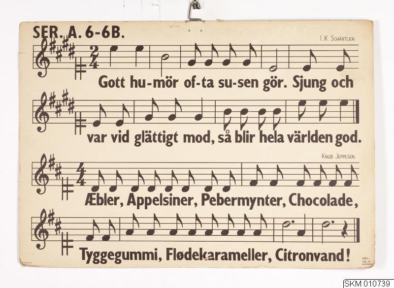 Orbis's sång- och musiktavlor: Ser. A. 6-6B. Med metallhängare. Vit med svart tryck.