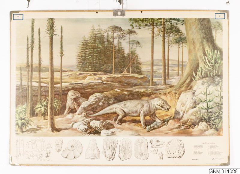 Urtidstavlor: Trias: Brokig sandsten. Urkräldjur. Färg. Skada nedre höger o vänster hörn.