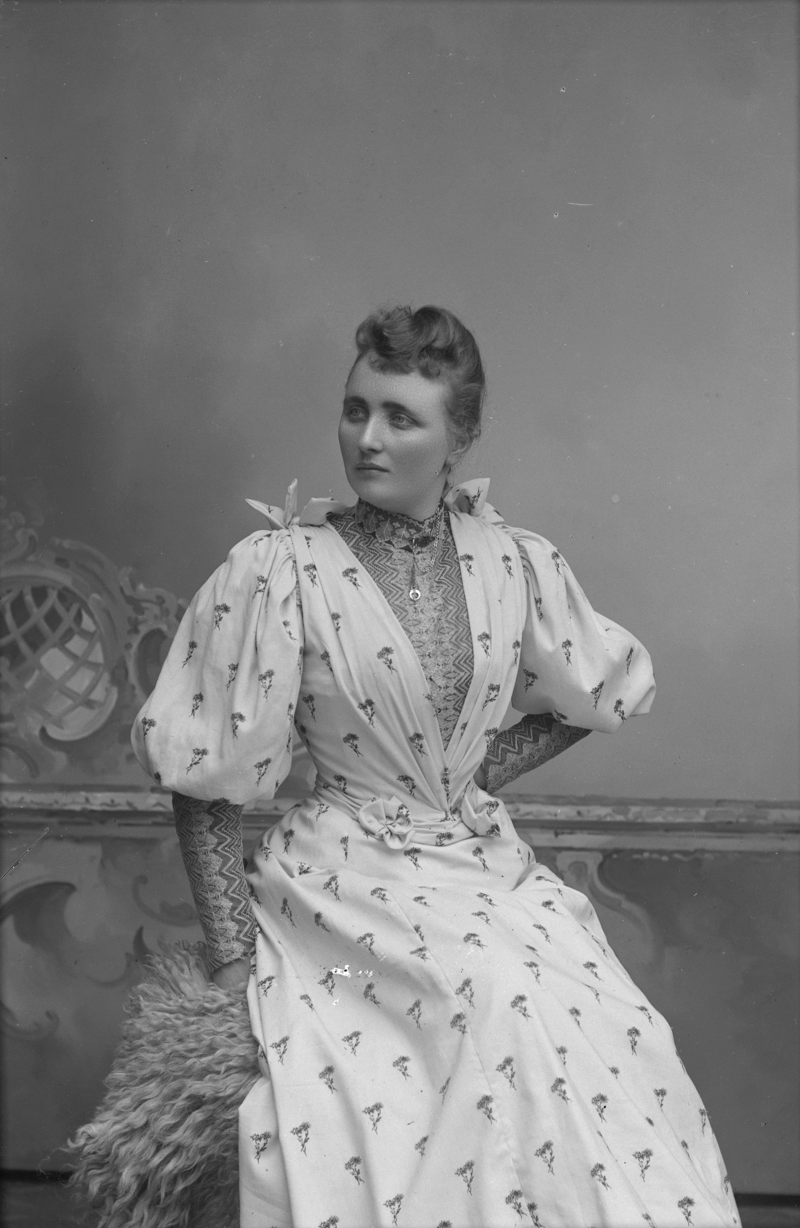Porträtt i halvfigur av pigan Anna Severin, dotter till smeden Nils Ingvarsson Severin (1851-1927) och Hanna Torkelsson (1846-1907).