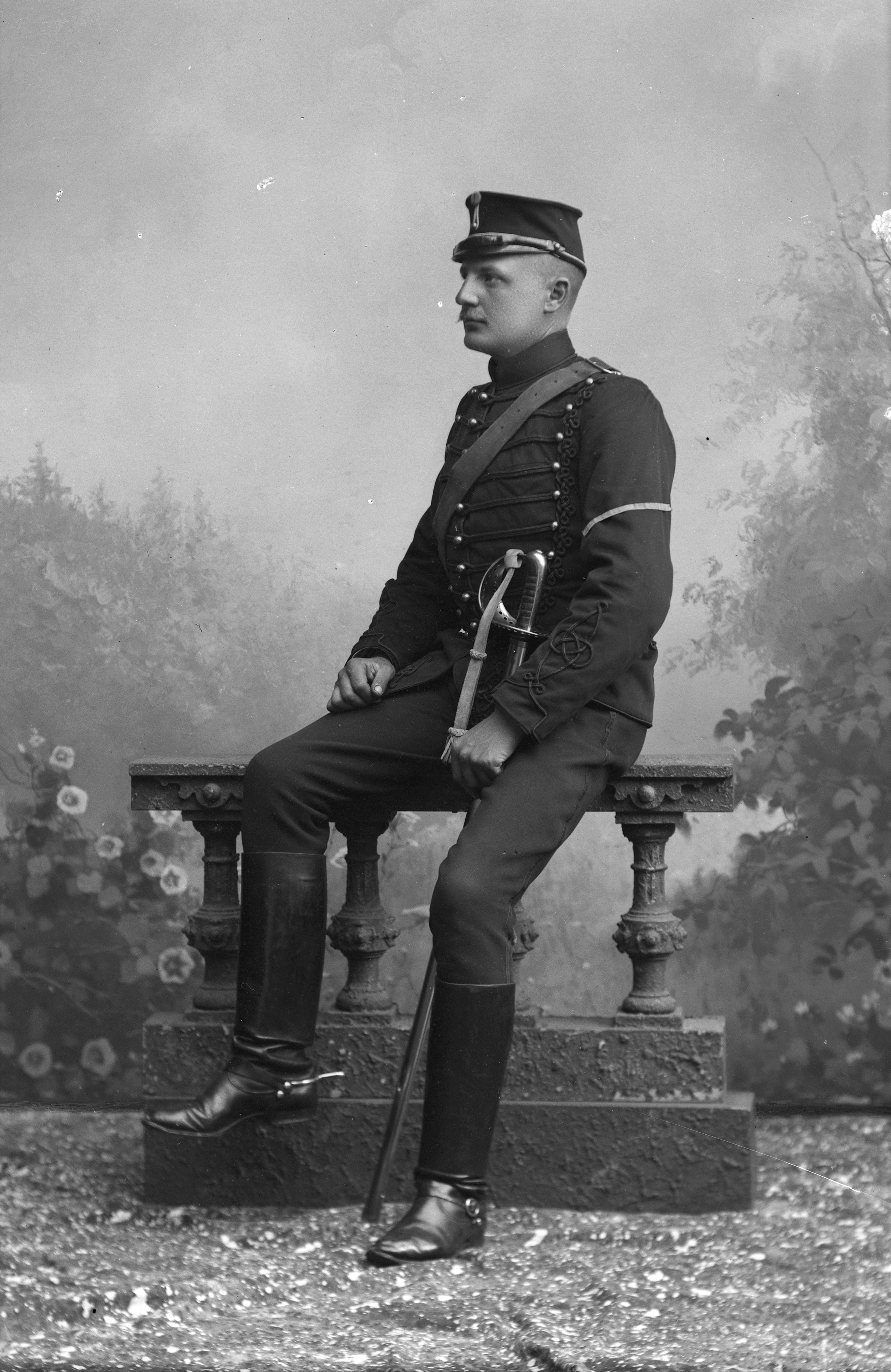 Porträtt i helfigur av soldaten Vesterberg i militäruniform med sabel, sittande på stenstaket. En ateljéfond med dimmigt skogsmotiv ugör bakgrunden.