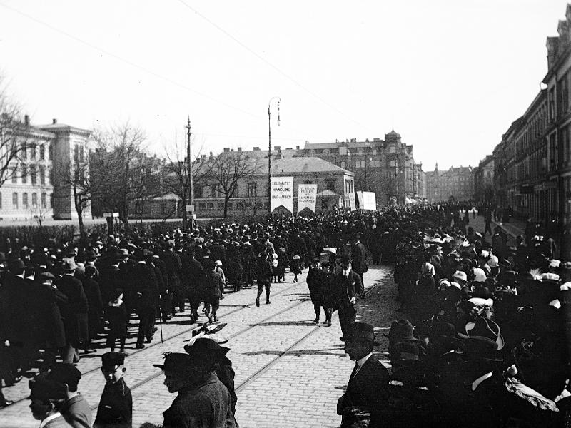 - Gatubild, folksamling, demonstration på Amiralsgatan. "Vi kräver frihet åt Amaltheamannen", cirka 1910.