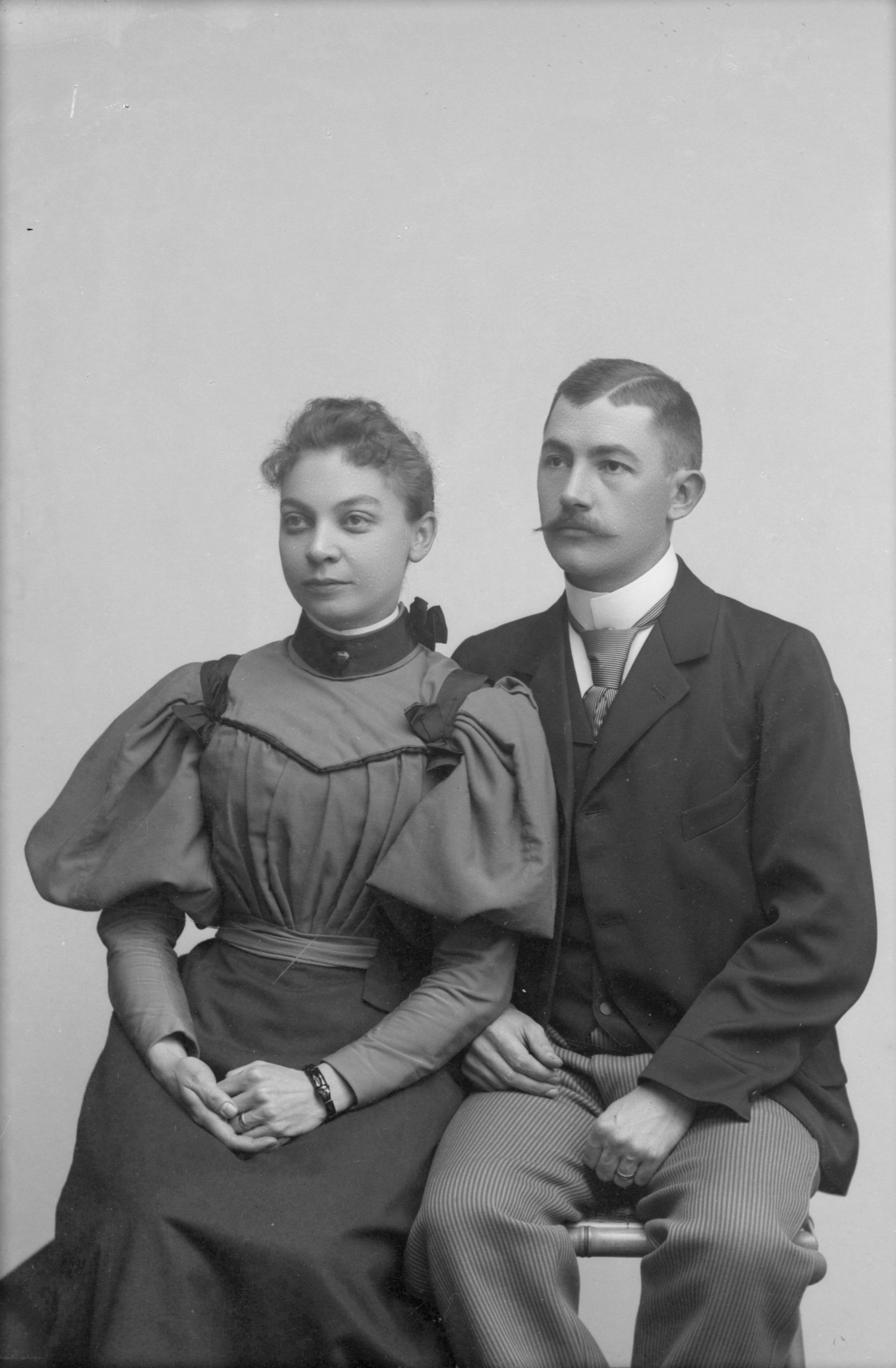 Porträtt i helfigur av kammarskrivare Viktor Gjörloff med blivande frun Augusta Olsson.