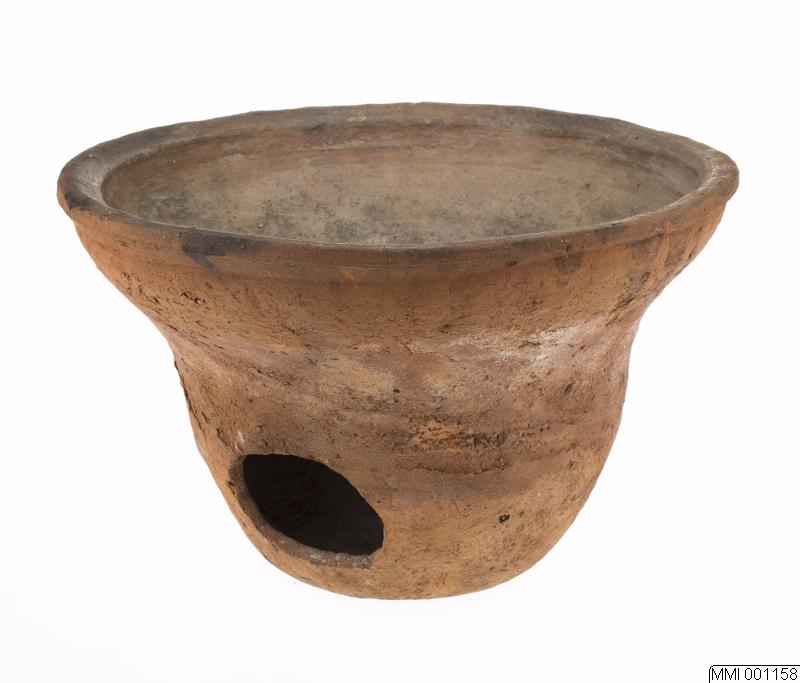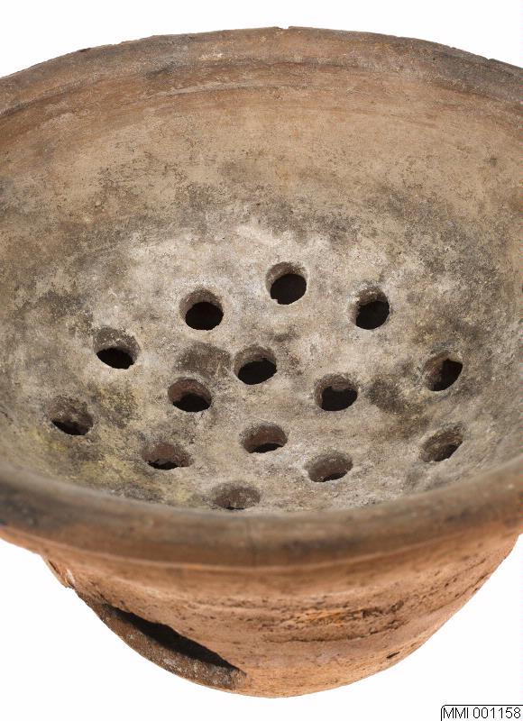 Fyrfat av rödbrunt lergods bstående av en kammare med ett antal runda hål som förbinder kammare och fat.