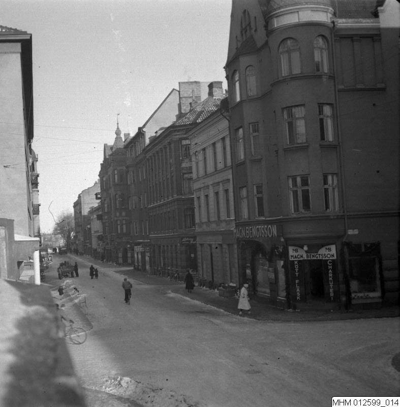 - Norregatan mot Drottningtorget, vid Stora Kvarngatan, omkring 1945. Bilden är tagen från andra våningen på Norregatan 27. I 27:an bodde Keander 1936-1947. Huset där Magn. Bengtssons affär ligger, med ingång på hörnet, hade postadress Stora Kvarngatan. Det vita huset var Norregatan 16 och därefter Norregatan 14, där Keander bodde på femte våningen 1923-1929. Mellan 14 och 16 löpte en gränd in vid namn Vallagränd. Längst in till vänster bodde bröderna Frank som båda sålde tidningar vid Kaptensbron, Södra Promenaden, i många år. I Vallagränd låg även i flera år bröderna Modigs Bleck- & Plåtslageri.