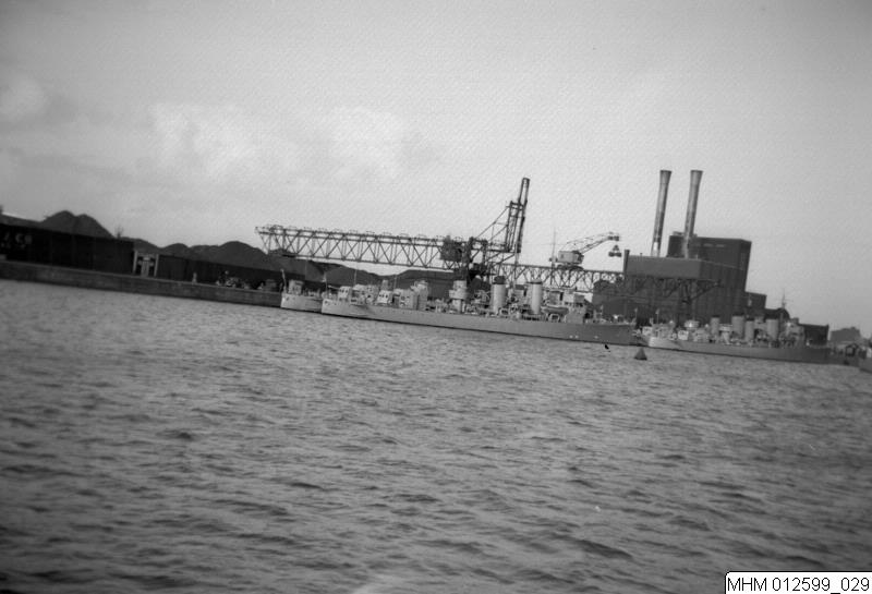 Fyra svenska jagare förtöjda i Nyhamnen intill Sydkrafts gamla koleldade ångpannecentral, 1944.