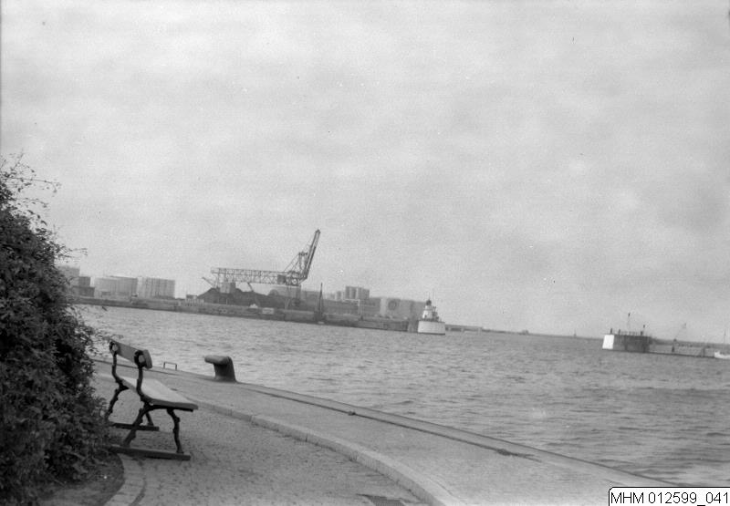 - Utsikt mot hamninloppet från "Drottningsoffan", ca 1945. "På 20- och 30-talet låg, där bänken står på bilden, en träkonstruktion uppbyggd som en slags utsiktsplats med bänkar. Byggd av grova timmerbjälkar liksom hela kajkonstruktionen runt där gamla smörkontrollen ligger i dag. Här doftade tjära speciellt när man en solig sommardag gjorde en utflykt hit.Den här utsiktsplatsen kallades på den tiden drottningsoffan." (Keanders egna kommentarer)