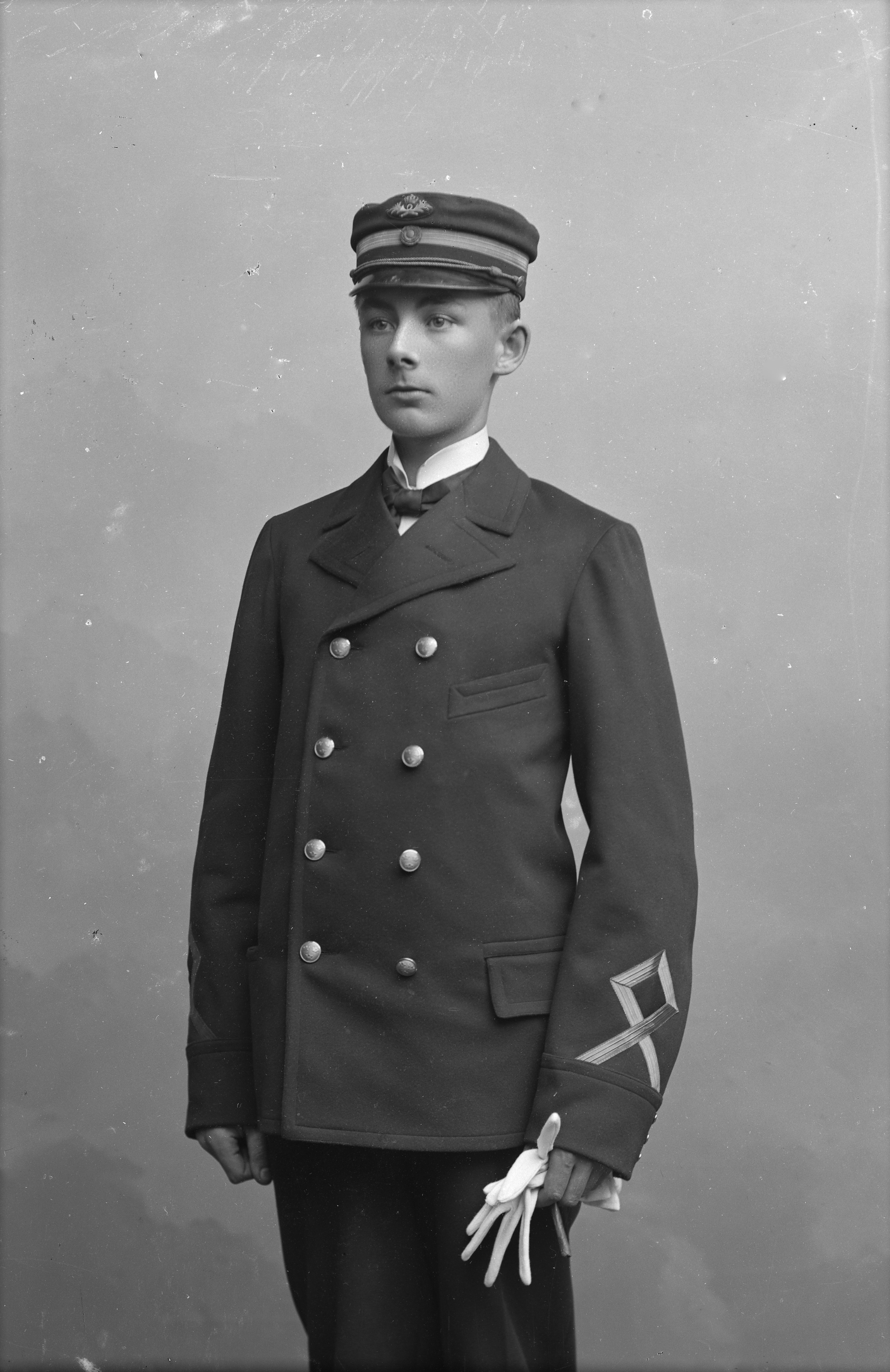 Porträtt i helfigur av herr Rosengren, postanställd, iklädd yrkesuniform och skärmmössa.