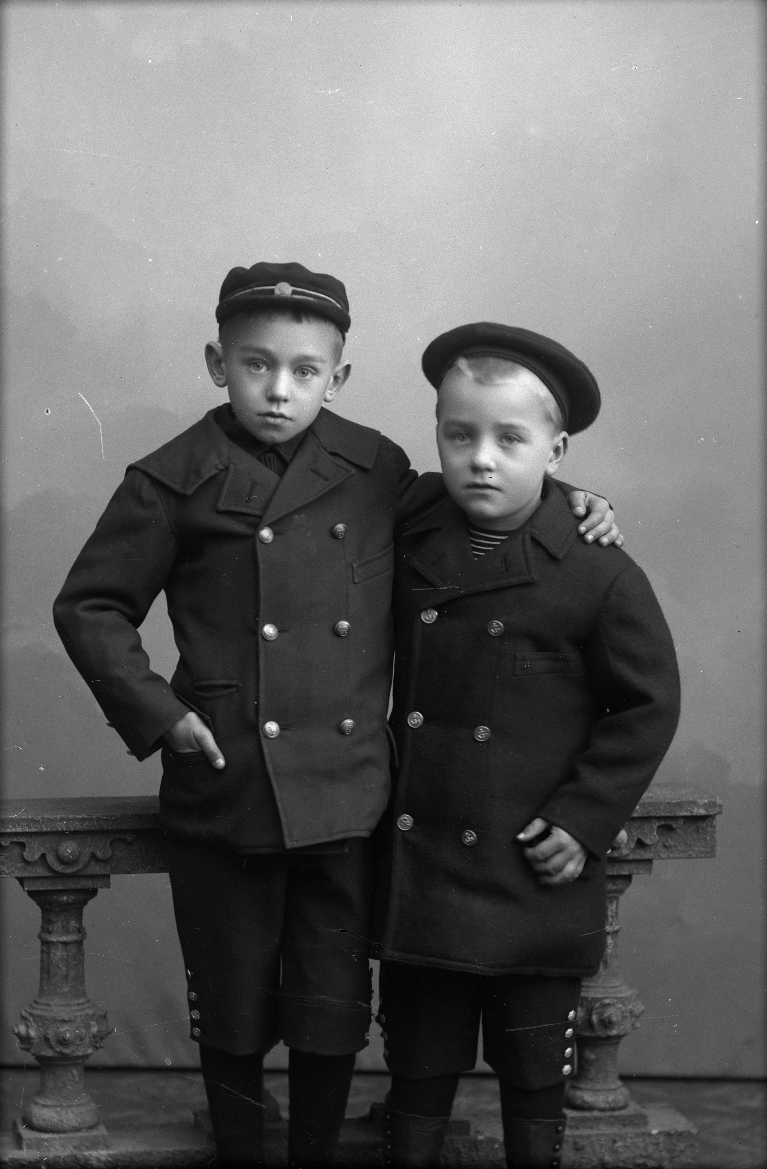 Porträtt i helfigur av fru Malmgrens söner, iklädda ytterkläder och mössor.
